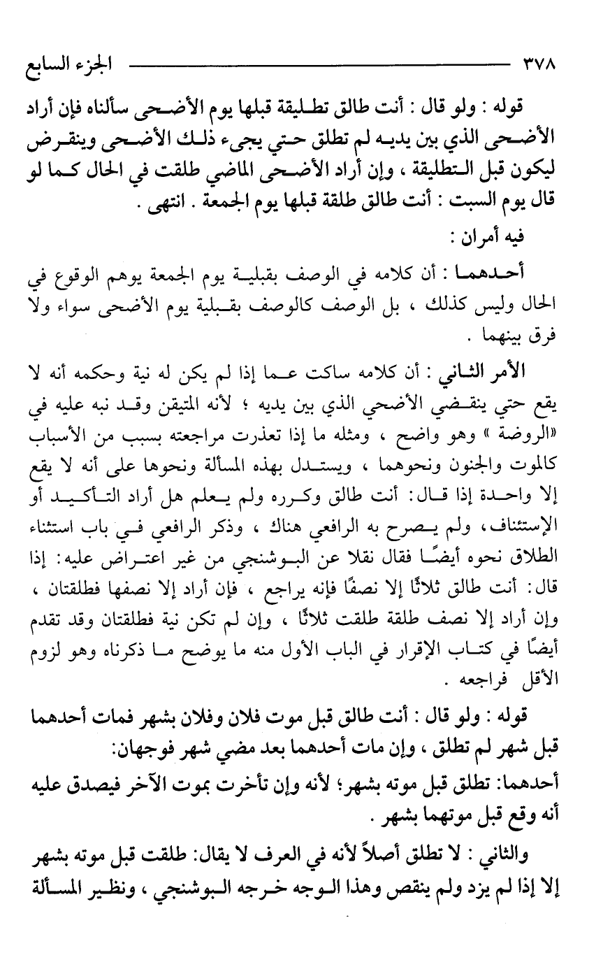 الأمر الثاني: أن كلامه ساكت عما إذا لم يكن له نية وحكمه أنه لا يقع حتي ينقضي الأضحي الذي بين يديه؛ لأنه المتيقن وقد نبه عليه في "الروضة" وهو واضح، ومثله ما إذا تعذرت مراجعته بسبب من الأسباب كالموت والجنون ونحوهما، ويستدل بهذه المسألة ونحوها على أنه لا يقع إلا واحدة إذا قال: أنت طالق وكرره ولم يعلم هل أراد التأكيد أو الإستئناف، ولم يصرح به الرافعي هناك، وذكر الرافعي في باب استثناء الطلاق نحوه أيضًا فقال نقلا عن البوشنجي من غير اعتراض عليه: إذا قال: أنت طالق ثلاثًا إلا نصفًا فإنه يراجع، فإن أراد إلا نصفها فطلقتان، وإن أراد إلا نصف طلقة طلقت ثلاثًا، وإن لم تكن نية فطلقتان وقد تقدم أيضًا في كتاب الإقرار في الباب الأول منه ما يوضح ما ذكرناه وهو لزوم الأقل فراجعه.