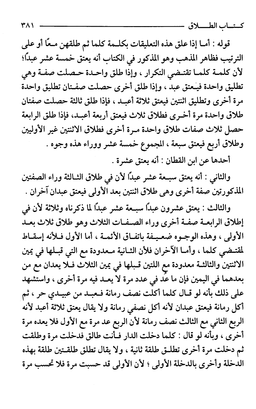 والثالث: يعتق عشرون عبدًا سبعة عشر عبدًا لما ذكرناه وثلاثة لأن في إطلاق الرابعة صفة أخرى وراء الصفات الثلاث وهو طلاق ثلاث بعد الأولى، وهذه الوجوه ضعيفة باتفاق الأئمة، أما الأول فلأنه إسقاط لمقتضي كلما، وأما الآخران فلأن الثانية معدودة مع التي قبلها في يمين الاثنتين والثالثة معدودة مع اللتين قبلها في يمين الثلاث فلا يعدان مع من بعدهما في اليمين فإن ما عُد في عدد مرة لا يعد فيه مرة أخرى، واستشهد على ذلك بأنه لو قال كلما أكلت نصف رمانة فعبد من عبيدي حر، ثم أكل رمانة فيعتق عبدان لأنه أكل نصفي رمانة ولا يقال يعتق ثلاثة أعبد لأنه الربع الثاني مع الثالث نصف رمانة لأن الربع عد مرة مع الأول فلا يعده مرة أخرى، وبأنه لو قال: كلما دخلت الدار فأنت طالق فدخلت مرة وطلقت ثم دخلت مرة أخرى تطلق طلقة ثانية، ولا يقال تطلق طلقتين طلقة بهذه الدخلة وأخرى بالدخلة الأولى؛ لأن الأولى قد حسبت مرة فلا تحسب مرة