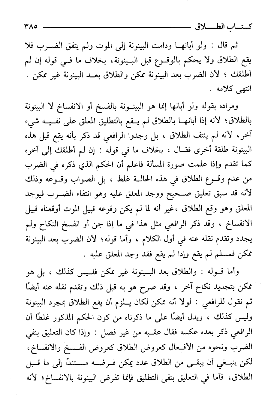 وأما قوله: والطلاق بعد البينونة غير ممكن فليس كذلك، بل هو ممكن بتجديد نكاح آخر، وقد صرح هو به قبل ذلك وتقدم نقله عنه أيضًا ثم نقول للرافعي: لولا أنه ممكن لكان يلزم أن يقع الطلاق بمجرد البينونة وليس كذلك، ويدل أيضًا على ما ذكرناه من كون الحكم المذكور غلطًا أن الرافعي ذكر بعده عكسه فقال عقبه من غير فصل: وإذا كان التعليق بنفي الضرب ونحوه من الأفعال كعروض الطلاق كعروض الفسخ والانفساخ، لكن ينبغي أن يبقى من الطلاق عدد يمكن فرضه مستندًا إلى ما قبل الطلاق، فأما في التعليق بنفى التطليق فإنما تفرض البينونة بالانفساخ؛ لأنه