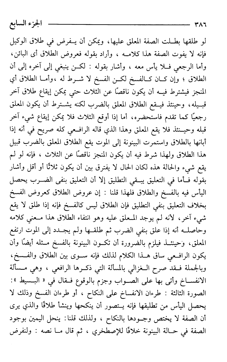 لو طلقها بطلت الصفة المعلق عليها، ويمكن أن يفرض في طلاق الوكيل فإنه لا يفوت الصفة هذا كلامه، وأراد بقوله فعروض الطلاق أى البائن، وأما الرجعي فلا يأس معه، وأشار بقوله: لكن ينبغي إلى آخره إلى أن الطلاق؛ وإن كان كالفسخ لكن الفسخ لا شرط له، وأما الطلاق أي المنجز فيشترط فيه أن يكون ناقصًا عن الثلاث حتي يمكن إيقاع طلاق آخر قبيله، وحينئذ فيقع الطلاق المعلق بالضرب لكنه يشترط أن يكون المعلق رجعيًا كما تقدم فاستحضره، أما إذا أوقع الثلاث فلا يمكن إيقاع شيء آخر قبله وحينئذ فلا يقع المعلق وهذا الذي قاله الرافعي كله صريح في أنه إذا أبانها بالطلاق واستمرت البينونة إلى الموت يقع الطلاق المعلق بالضرب قبيل هذا الطلاق ولهذا شرط فيه أن يكون المنجز ناقصًا عن الثلاث، فإنه لو لم يقع شيء والحالة هذه لكان الحال لا يفترق بين أن يكون ثلاثًا أو أقل وأشار بقوله فأما في التعليق يبقي التطليق إلا أن التعليق بنفى الضرب يحصل اليأس فيه بالفسخ والطلاق فلهذا قلنا: إن عروض الطلاق كعروض الفسخ بخلاف التعليق بنفي التطليق فإن الطلاق ليس كالفسخ فإنه إذا طلق لا يقع شيء آخر، لأنه لم يوجد المعلق عليه وهو انتفاء الطلاق هذا معني كلامه وحاصله أنه إذا علق بنفي الضرب ثم طلقها ولم يجدد إلى الموت ارتفع المعلق، وحينئذ فيلزم بالضرورة أن تكون البينونة بالفسخ مثله أيضًا وأن يكون الرافعي ساق هذا الكلام لذلك فإنه سوى بين الطلاق والفسخ، وبالجملة فقد صرح الغزالي بالمسألة التي ذكرها الرافعي، وهي مسألة الانفساخ وأتى بها على الصواب وجزم بالوقوع فقال في "البسيط": الصورة الثالثة: طرءان الانفساخ على النكاح، أو طرءان الفسخ وذلك لا يحصل اليأس من تطليقها فإنه يتصور أن ينكحها وينشأ طلاقًا والذي يرى أن الصفة لا يختص وجودها بالنكاح، ولذلك قلنا: ينحل اليمين بوجود الصفة في حالة البينونة خلافًا للإصطخري، ثم قال ما نصه: ولنفرض