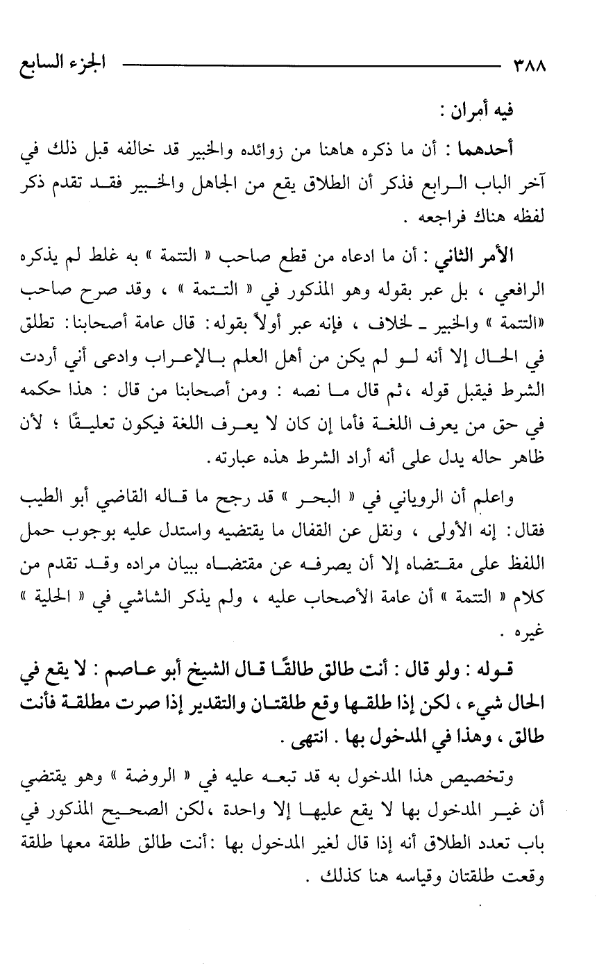 الأمر الثاني: أن ما ادعاه من قطع صاحب "التتمة" به غلط لم يذكره الرافعي، بل عبر بقوله وهو المذكور في "التتمة"، وقد صرح صاحب "التتمة" والخبير -لخلاف، فإنه عبر أولًا بقوله: قال عامة أصحابنا: تطلق في الحال إلا أنه لو لم يكن من أهل العلم بالإعراب وادعى أني أردت الشرط فيقبل قوله، ثم قال ما نصه: ومن أصحابنا من قال: هذا حكمه في حق من يعرف اللغة فأما إن كان لا يعرف اللغة فيكون تعليقًا؛ لأن ظاهر حاله يدل على أنه أراد الشرط هذه عبارته.