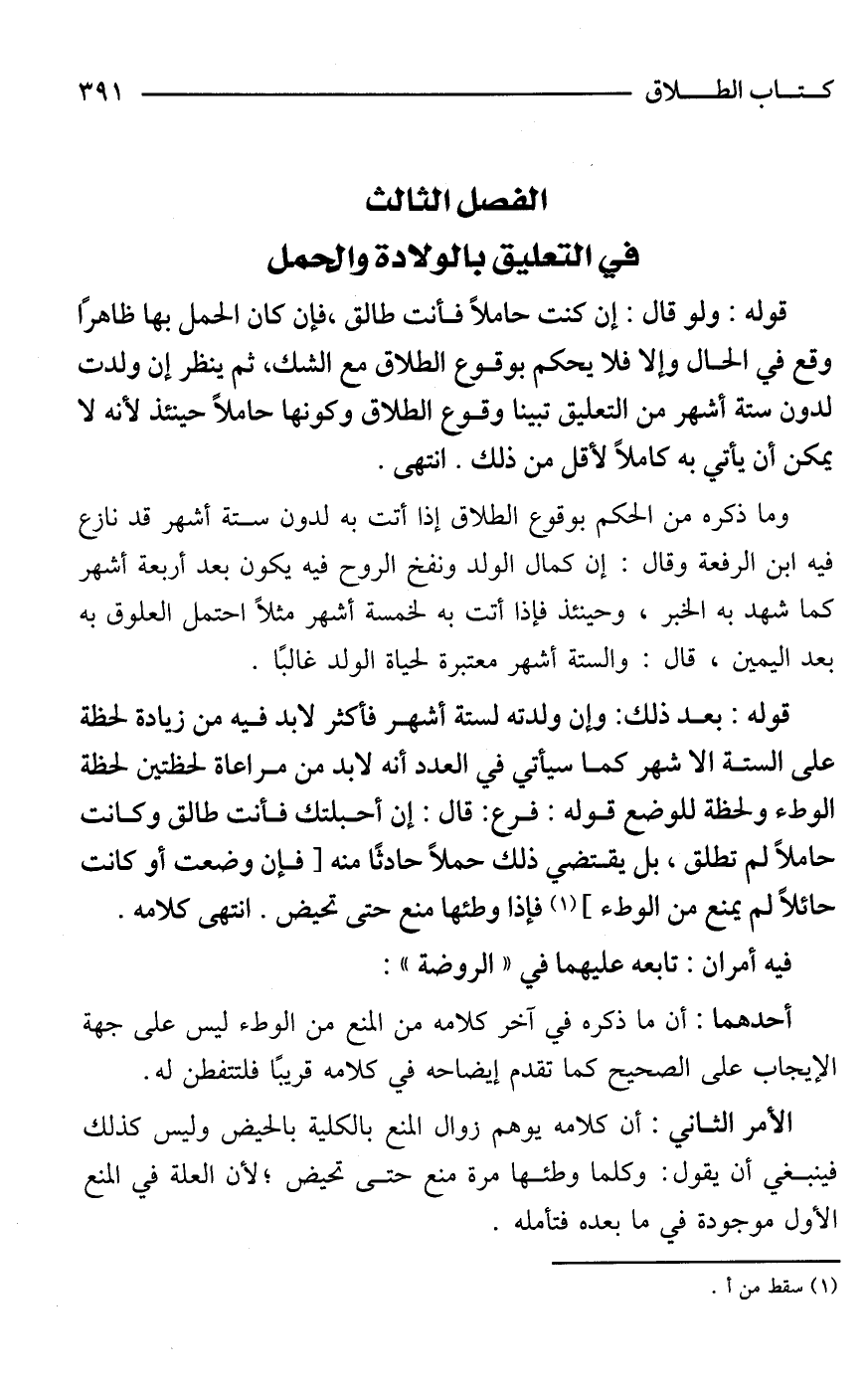 قوله: بعد ذلك: وإن ولدته لستة أشهر فأكثر لابد فيه من زيادة لحظة على الستة الأشهر كما سيأتي في العدد أنه لابد من مراعاة لحظتين لحظة الوطء ولحظة للوضع قوله: فرع: قال: إن أحبلتك فأنت طالق وكانت حاملًا لم تطلق، بل يقتضي ذلك حملًا حادثًا منه [فإن وضعت أو كانت حائلًا لم يمنع من الوطء] (¬1) فإذا وطئها منع حتى تحيض. انتهى كلامه.
