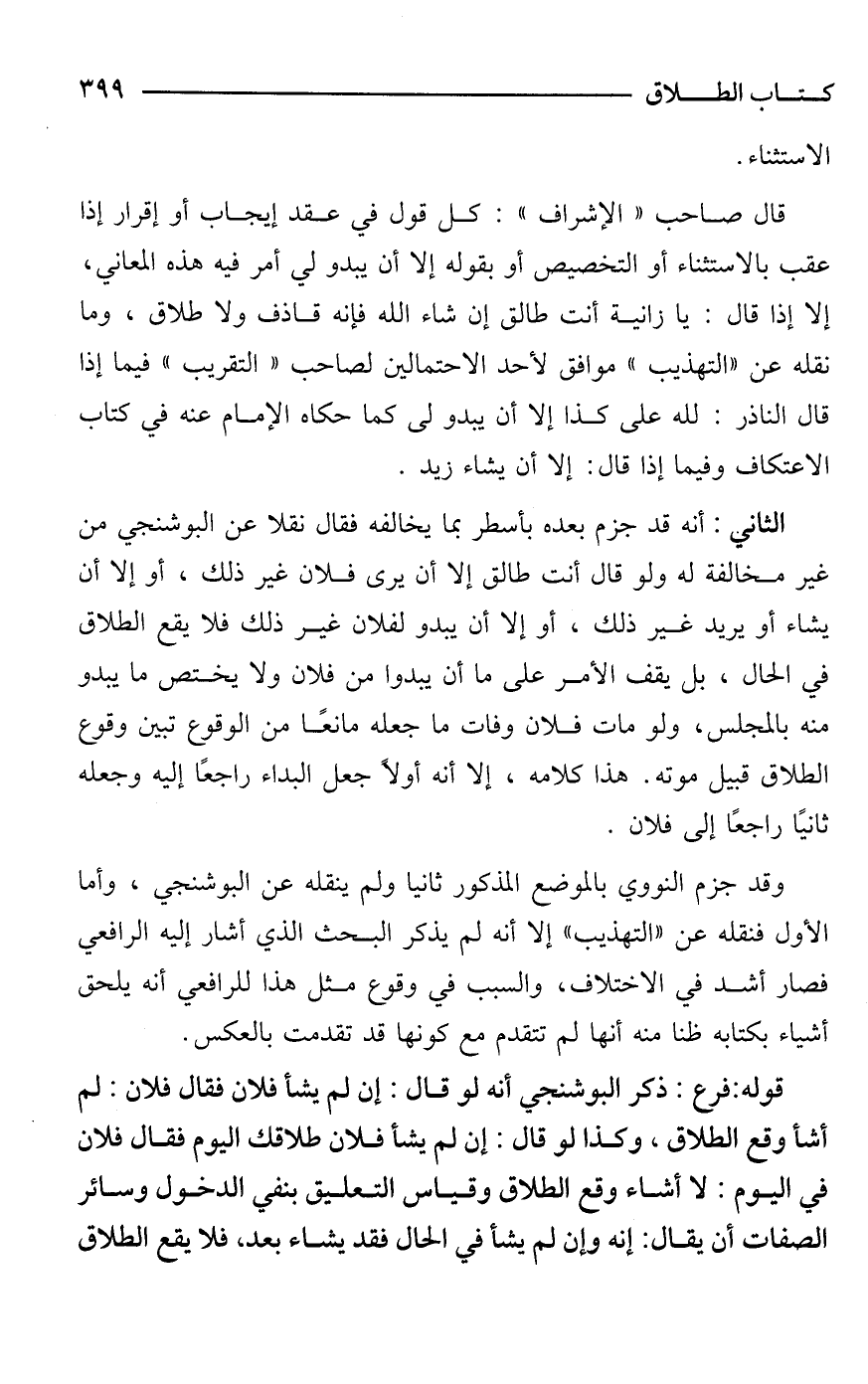 الثاني: أنه قد جزم بعده بأسطر بما يخالفه فقال نقلا عن البوشنجي من غير مخالفة له ولو قال أنت طالق إلا أن يرى فلان غير ذلك، أو إلا أن يشاء أو يريد غير ذلك، أو إلا أن يبدو لفلان غير ذلك فلا يقع الطلاق في الحال، بل يقف الأمر على ما أن يبدوا من فلان ولا يختص ما يبدو منه بالمجلس، ولو مات فلان وفات ما جعله مانعًا من الوقوع تبين وقوع الطلاق قبيل موته. هذا كلامه، إلا أنه أولًا جعل البداء راجعًا إليه وجعله ثانيًا راجعًا إلى فلان.