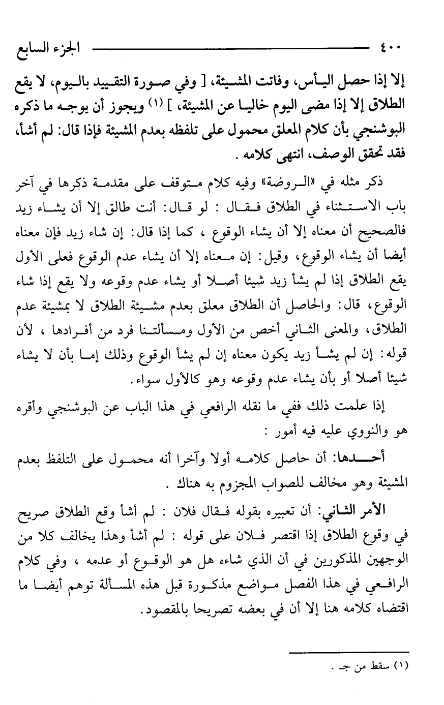 الأمر الثاني: أن تعبيره بقوله فقال فلان: لم أشأ وقع الطلاق صريح في وقوع الطلاق إذا اقتصر فلان على قوله: لم أشأ وهذا يخالف كلا من الوجهين المذكورين في أن الذي شاءه هل هو الوقوع أو عدمه، وفي كلام الرافعي في هذا الفصل مواضع مذكورة قبل هذه المسألة توهم أيضا ما اقتضاه كلامه هنا إلا أن في بعضه تصريحا بالمقصود.