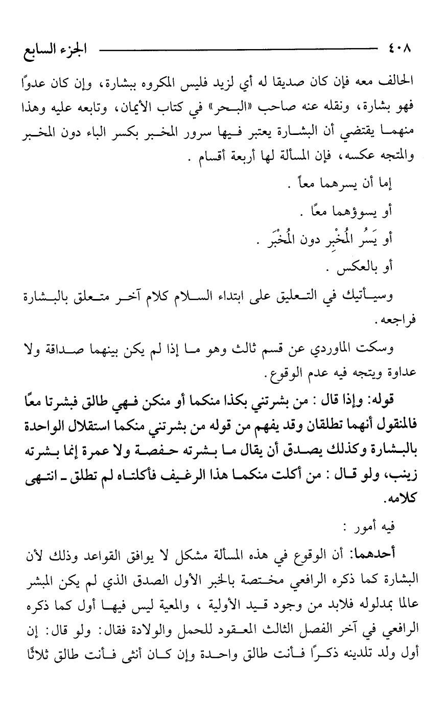 الحالف معه فإن كان صديقا له أي لزيد فليس المكروه ببشارة، وإن كان عدوًا فهو بشارة، ونقله عنه صاحب "البحر" في كتاب الأيمان، وتابعه عليه وهذا منهما يقتضي أن البشارة يعتبر فيها سرور المخبر بكسر الباء دون المخبر والمتجه عكسه، فإن المسألة لها أربعة أقسام.