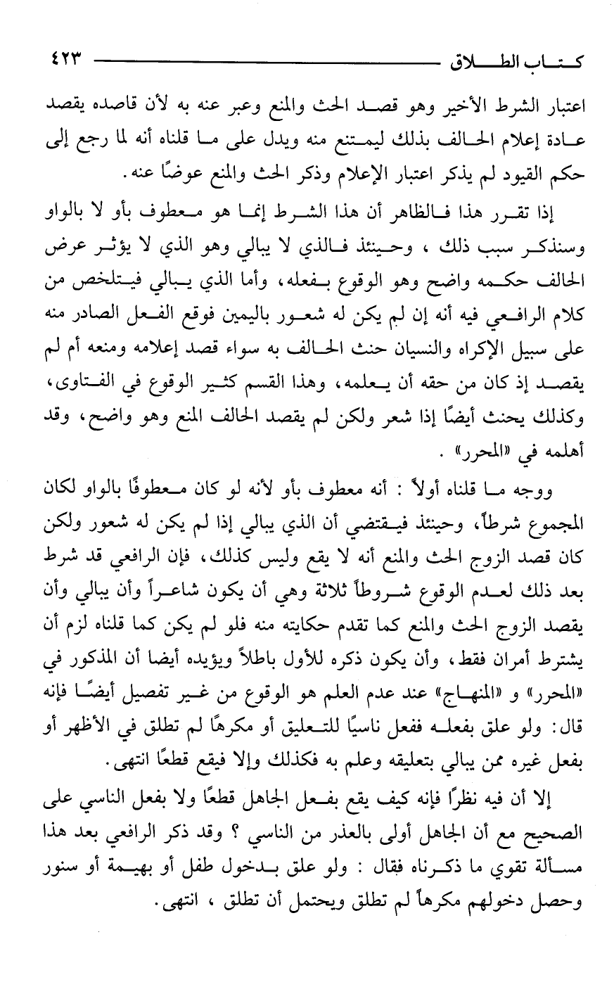 ووجه ما قلناه أولًا: أنه معطوف بأو لأنه لو كان معطوفًا بالواو لكان المجموع شرطًا، وحينئذ فيقتضي أن الذي يبالي إذا لم يكن له شعور ولكن كان قصد الزوج الحث والمنع أنه لا يقع وليس كذلك، فإن الرافعي قد شرط بعد ذلك لعدم الوقوع شروطًا ثلاثة وهي أن يكون شاعرًا وأن يبالي وأن يقصد الزوج الحث والمنع كما تقدم حكايته منه فلو لم يكن كما قلناه لزم أن يشترط أمران فقط، وأن يكون ذكره للأول باطلًا ويؤيده أيضا أن المذكور في "المحرر" و"المنهاج" عند عدم العلم هو الوقوع من غير تفصيل أيضًا فإنه قال: ولو علق بفعله ففعل ناسيًا للتعليق أو مكرهًا لم تطلق في الأظهر أو بفعل غيره ممن يبالي بتعليقه وعلم به فكذلك وإلا فيقع قطعًا انتهى.