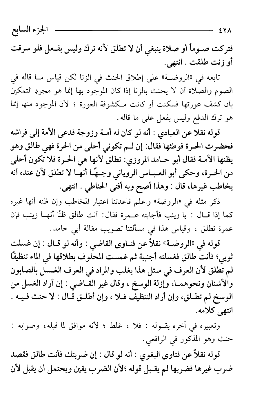 قوله نقلا عن العبادي: أنه لو كان له أمة وزوجة فدعى الأمة إلى فراشه فحضرت الحرة فوطئها فقال: إن لم تكوني أحلى من الحرة فهي طالق وهو يظنها الأمة فقال أبو حامد المروزي: تطلق لأنها هي الحرة فلا تكون أحلى من الحرة، وحكى أبو العباس الروياني وجهًا أنها لا تطلق لأن عنده أنه يخاطب غيرها، قال: وهذا أصح وبه أفتى الحناطي. انتهى.