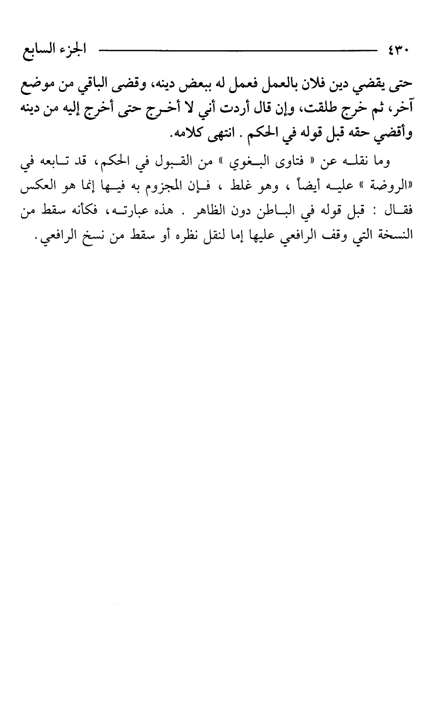 وما نقله عن "فتاوى البغوي" من القبول في الحكم، قد تابعه في "الروضة" عليه أيضًا، وهو غلط، فإن المجزوم به فيها إنما هو العكس فقال: قبل قوله في الباطن دون الظاهر. هذه عبارته، فكأنه سقط من النسخة التي وقف الرافعي عليها إما لنقل نظره أو سقط من نسخ الرافعي.