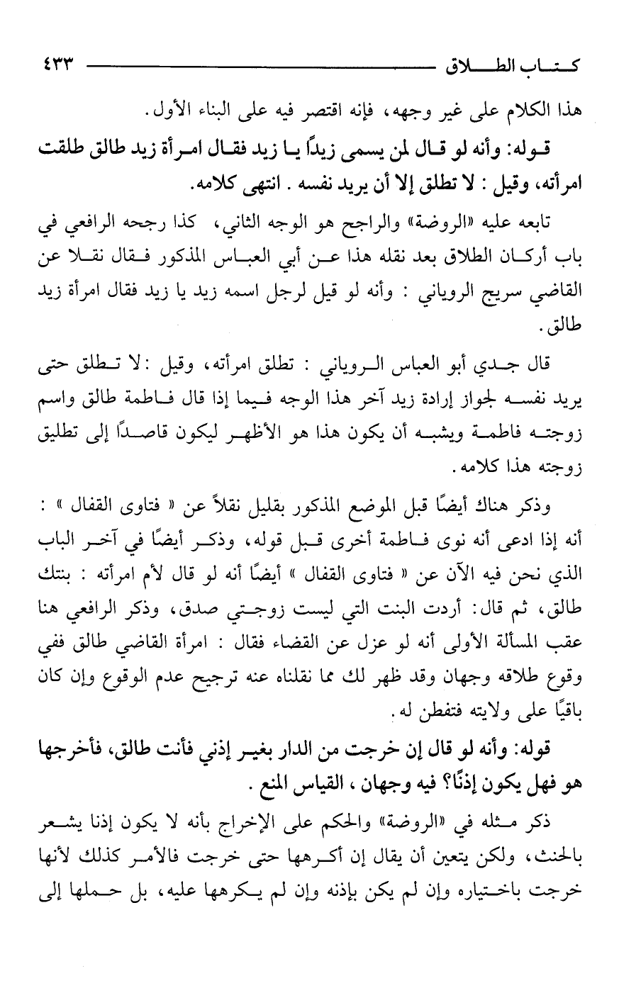 قال جدي أبو العباس الروياني: تطلق امرأته، وقيل: لا تطلق حتى يريد نفسه لجواز إرادة زيد آخر هذا الوجه فيما إذا قال فاطمة طالق واسم زوجته فاطمة ويشبه أن يكون هذا هو الأظهر ليكون قاصدًا إلى تطليق زوجته هذا كلامه.