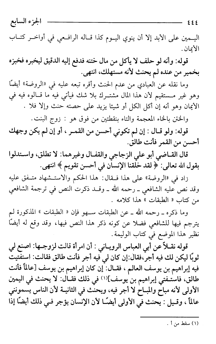 قوله نقلًا عن أبي العباس الروياني: أن امرأة قالت لزوجها: اصنع لي ثوبًا ليكن لك فيه أجر، فقال: إن كان لي فيه أجر فأنت طالق فقالت: استفتيت فيه إبراهيم بن يوسف العالم، فقال: إن كان إبراهيم بن يوسف [عالمًا فأنت طالق، فاستفتي إبراهيم بن يوسف] (¬1) في ذلك فقال: لا يحنث في اليمين الأولى لأنه مباح والمباح لا أجر فيه، ويحنث في الثانية لأن الناس يسمونني عالمًا، وقيل: يحنث في الأولى أيضًا لأن الإنسان يؤجر في ذلك أيضًا إذا