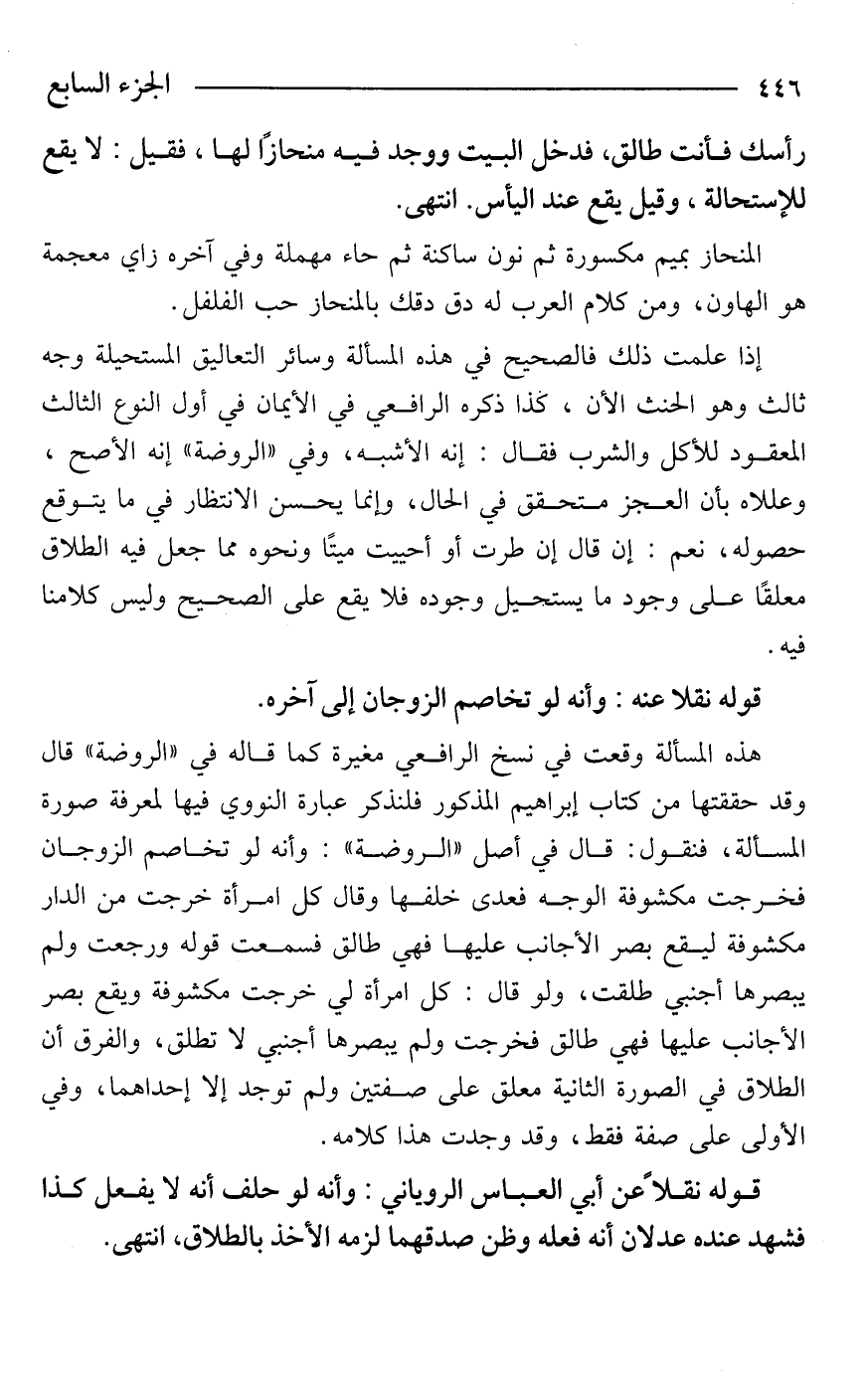 هذه المسألة وقعت في نسخ الرافعي مغيرة كما قاله في "الروضة" قال وقد حققتها من كتاب إبراهيم المذكور فلنذكر عبارة النووي فيها لمعرفة صورة المسألة، فنقول: قال في أصل "الروضة": وأنه لو تخاصم الزوجان فخرجت مكشوفة الوجه فعدى خلفها وقال كل امرأة خرجت من الدار مكشوفة ليقع بصر الأجانب عليها فهي طالق فسمعت قوله ورجعت ولم يبصرها أجنبي طلقت، ولو قال: كل امرأة لي خرجت مكشوفة ويقع بصر الأجانب عليها فهي طالق فخرجت ولم يبصرها أجنبي لا تطلق، والفرق أن الطلاق في الصورة الثانية معلق على صفتين ولم توجد إلا إحداهما، وفي الأولى على صفة فقط، وقد وجدت هذا كلامه.