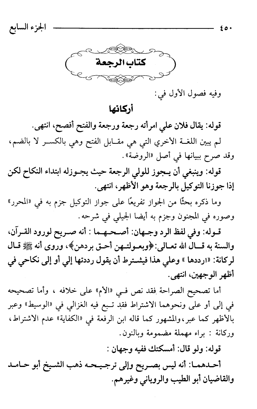 قوله: وفي لفظ الرد وجهان: أصحهما: أنه صريح لورود القرآن، والسنة به قال الله تعالى: {وَبُعُولَتُهُنَّ أَحَقُّ بِرَدِّهِنَّ}، وروى أنه - صَلَّى اللَّهُ عَلَيْهِ وَسَلَّمَ - قال لركانة: "ارددها" وعلي هذا فيشترط أن يقول رددتها إلي أو إلى نكاحي في أظهر الوجهين، انتهى.