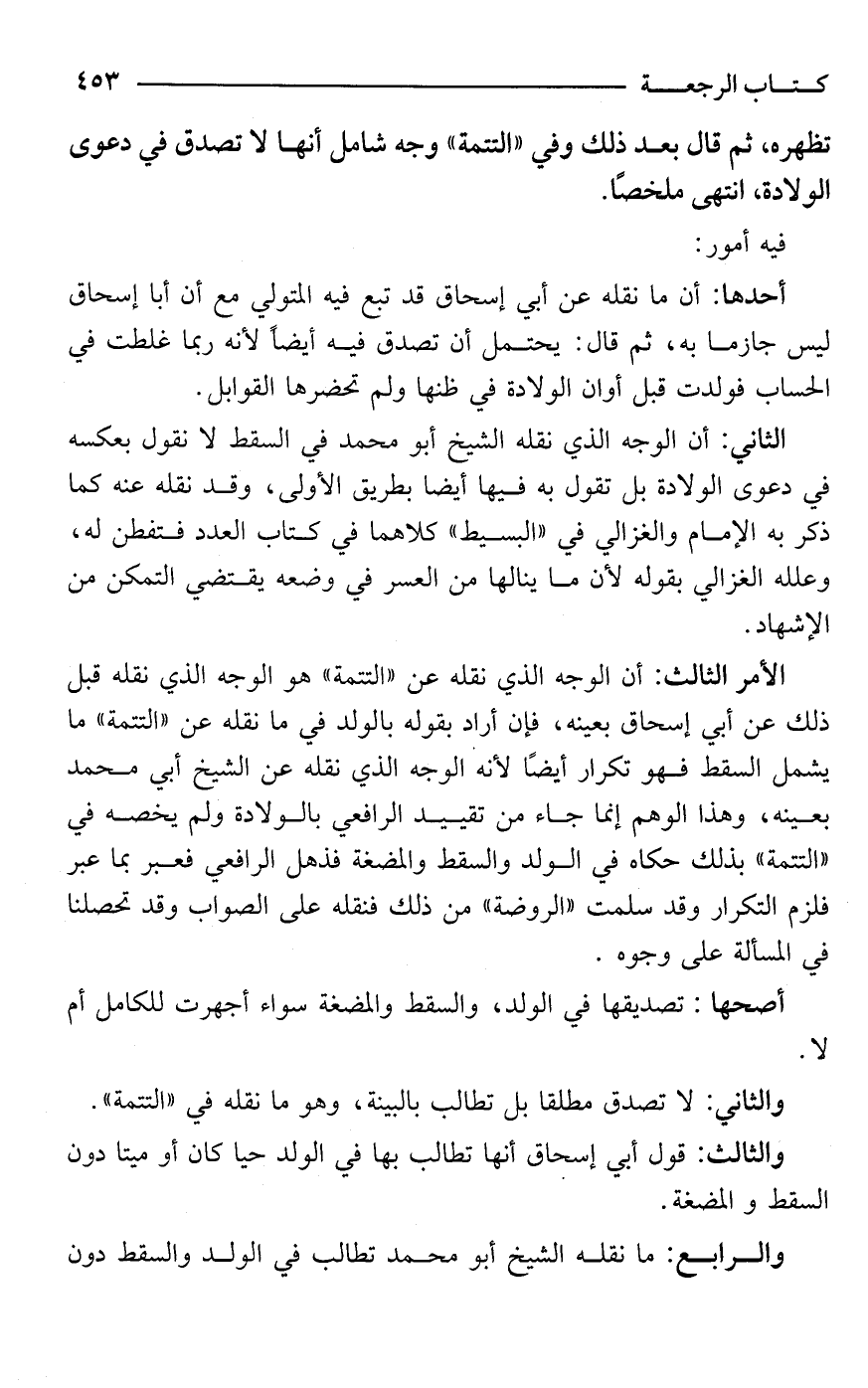 الأمر الثالث: أن الوجه الذي نقله عن "التتمة" هو الوجه الذي نقله قبل ذلك عن أبي إسحاق بعينه، فإن أراد بقوله بالولد في ما نقله عن "التتمة" ما يشمل السقط فهو تكرار أيضًا لأنه الوجه الذي نقله عن الشيخ أبي محمد بعينه، وهذا الوهم إنما جاء من تقييد الرافعي بالولادة ولم يخصه في "التتمة" بذلك حكاه في الولد والسقط والمضغة فذهل الرافعي فعبر بما عبر فلزم التكرار وقد سلمت "الروضة" من ذلك فنقله على الصواب وقد تحصلنا في المسألة على وجوه.