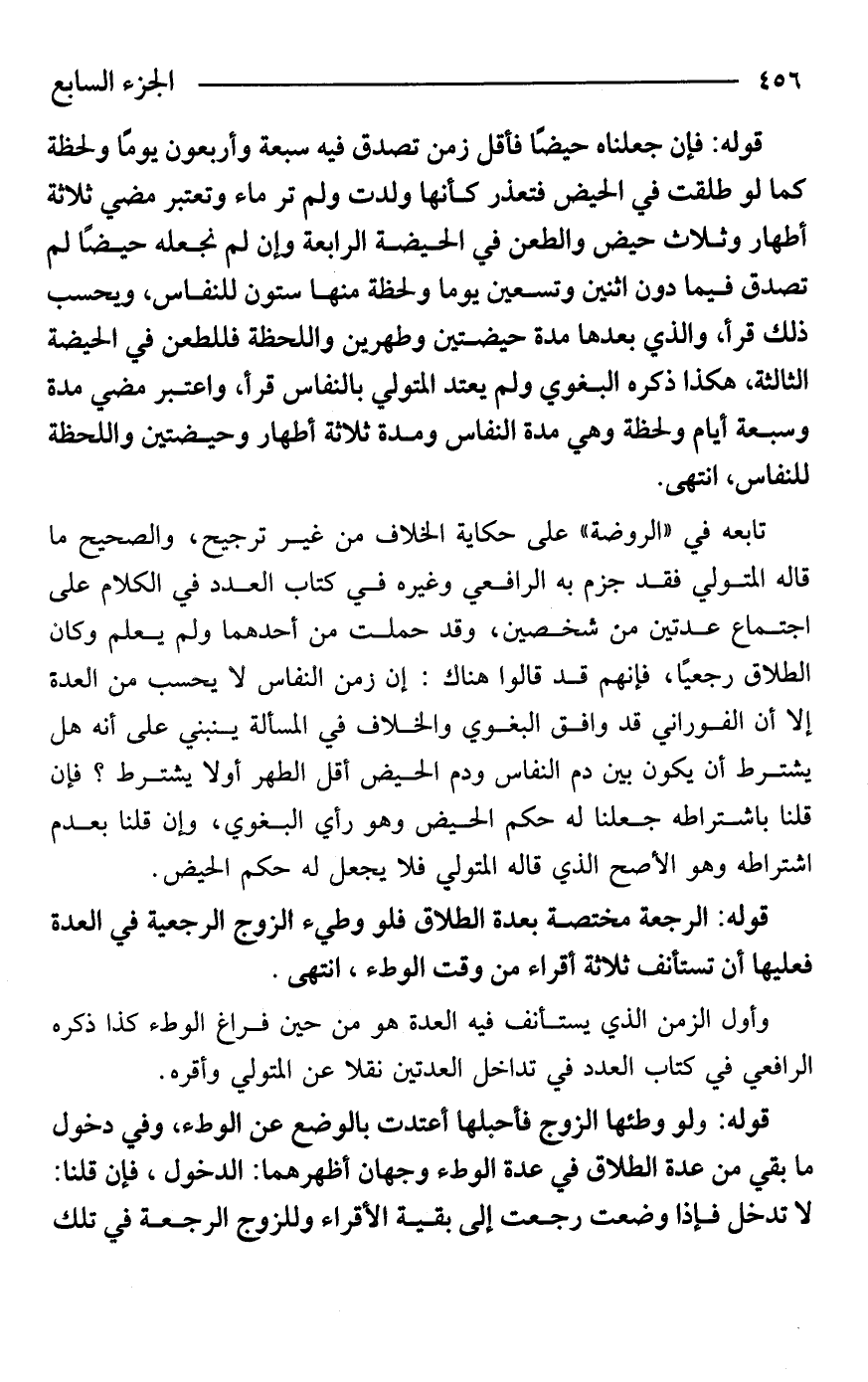 قوله: فإن جعلناه حيضًا فأقل زمن تصدق فيه سبعة وأربعون يومًا ولحظة كما لو طلقت في الحيض فتعذر كأنها ولدت ولم تر ماء وتعتبر مضي ثلاثة أطهار وثلاث حيض والطعن في الحيضة الرابعة وإن لم نجعله حيضًا لم تصدق فيما دون اثنين وتسعين يومًا ولحظة منها ستون للنفاس، ويحسب ذلك قرأ، والذي بعدها مدة حيضتين وطهرين واللحظة فللطعن في الحيضة الثالثة، هكذا ذكره البغوي ولم يعتد المتولي بالنفاس قرأ، واعتبر مضي مدة وسبعة أيام ولحظة وهي مدة النفاس ومدة ثلاثة أطهار وحيضتين واللحظة للنفاس، انتهى.