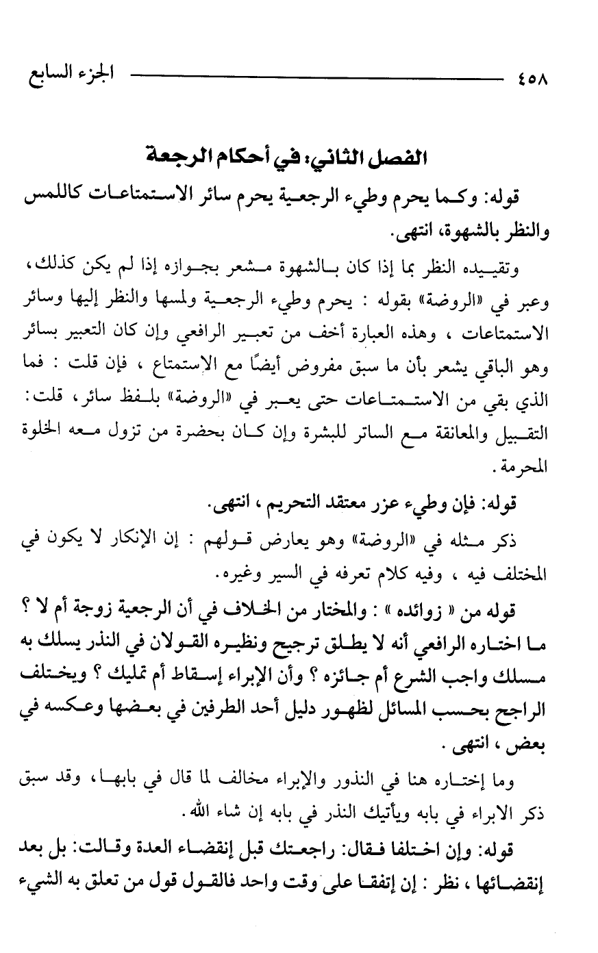 قوله من "زوائده": والمختار من الخلاف في أن الرجعية زوجة أم لا؟ ما اختاره الرافعي أنه لا يطلق ترجيح ونظيره القولان في النذر يسلك به مسلك واجب الشرع أم جائزه؟ وأن الإبراء إسقاط أم تمليك؟ ويختلف الراجح بحسب المسائل لظهور دليل أحد الطرفين في بعضها وعكسه في بعض، انتهى.