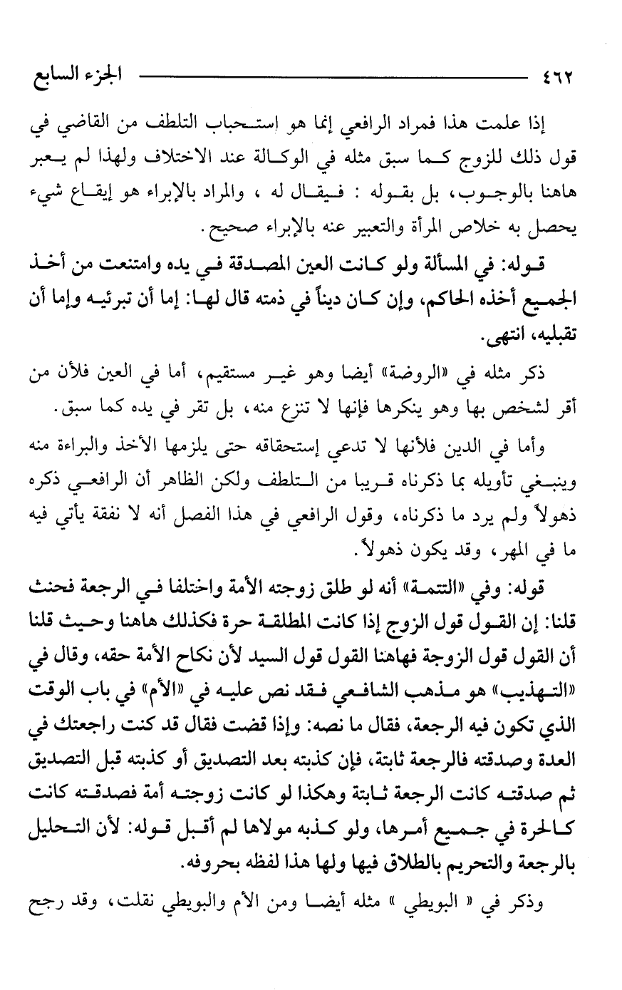 قوله: وفي "التتمة" أنه لو طلق زوجته الأمة واختلفا في الرجعة فحنث قلنا: إن القول قول الزوج إذا كانت المطلقة حرة فكذلك هاهنا وحيث قلنا أن القول قول الزوجة فهاهنا القول قول السيد لأن نكاح الأمة حقه، وقال في "التهذيب" هو مذهب الشافعي فقد نص عليه في "الأم" في باب الوقت الذي تكون فيه الرجعة، فقال ما نصه: وإذا قضت فقال قد كنت راجعتك في العدة وصدقته فالرجعة ثابتة، فإن كذبته بعد التصديق أو كذبته قبل التصديق ثم صدقته كانت الرجعة ثابتة وهكذا لو كانت زوجته أمة فصدقته كانت كالحرة في جميع أمرها، ولو كذبه مولاها لم أقبل قوله: لأن التحليل بالرجعة والتحريم بالطلاق فيها ولها هذا لفظه بحروفه.
