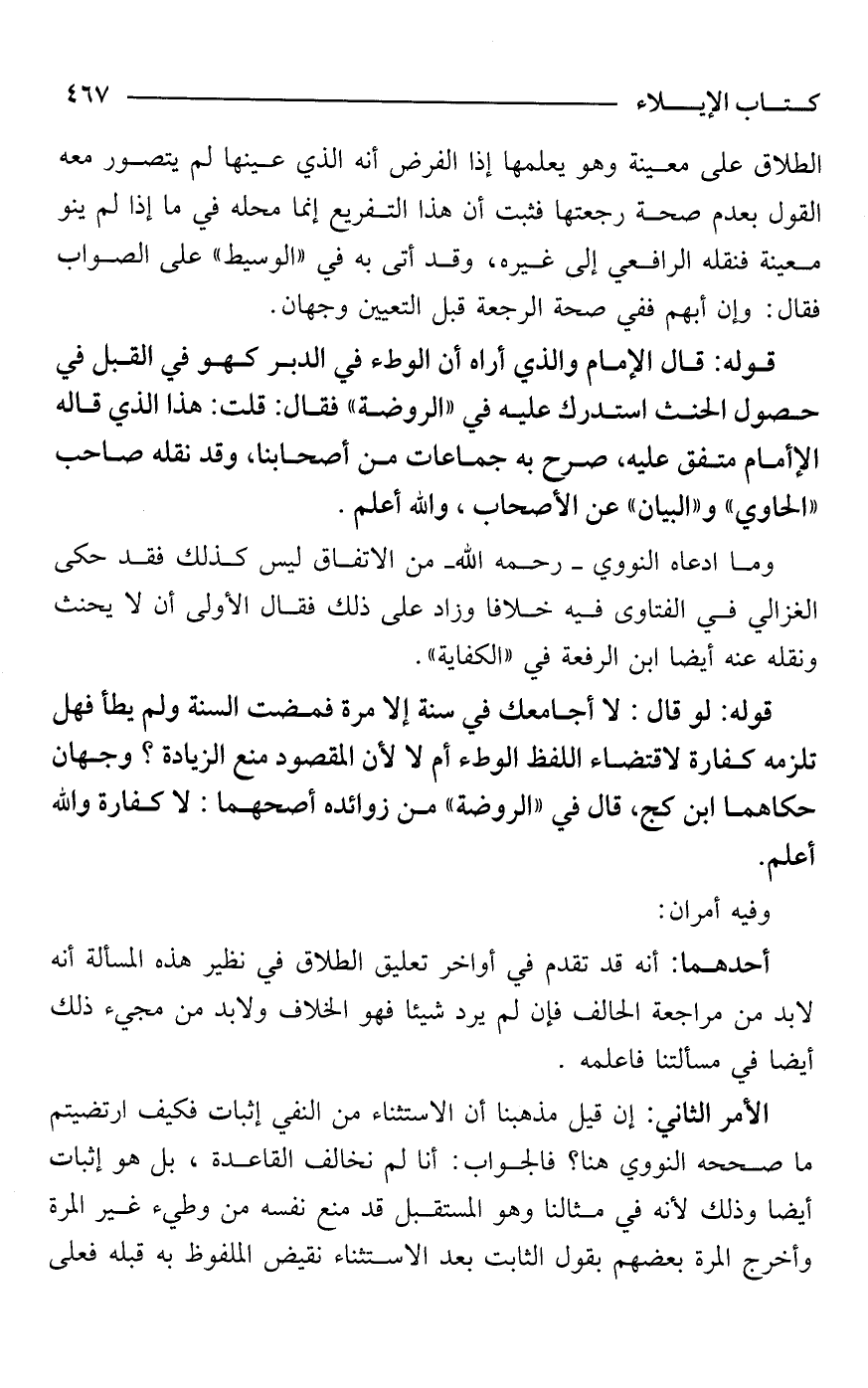 الأمر الثاني: إن قيل مذهبنا أن الاستثناء من النفي إثبات فكيف ارتضيتم ما صححه النووي هنا؟ فالجواب: أنا لم نخالف القاعدة، بل هو إثبات أيضًا وذلك لأنه في مثالنا وهو المستقبل قد منع نفسه من وطيء غير المرة وأخرج المرة بعضهم بقول الثابت بعد الاستثناء نقيض الملفوظ به قبله فعلى