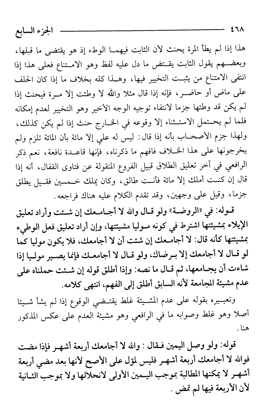 قوله: في "الروضة" ولو قال والله لا أجامعك إن شئت وأراد تعليق الإيلاء بمشيئتها اشترط في كونه موليًا مشيئتها، وإن أراد تعليق فعل الوطيء بمشيئتها كأنه قال: لا أجامعك إن شئت أن لا أجامعك، فلا يكون موليًا كما لو قال لا أجامعك إلا برضاك، ولو قال لا أجامعك فإنما يصير موليًا إذا شاءت أن يجامعها، ثم قال ما نصه: وإذا أطلق قوله إن شئت حملناه على عدم مشيئة المجامعة لأنه السابق أطلق إلى الفهم، انتهى كلامه.