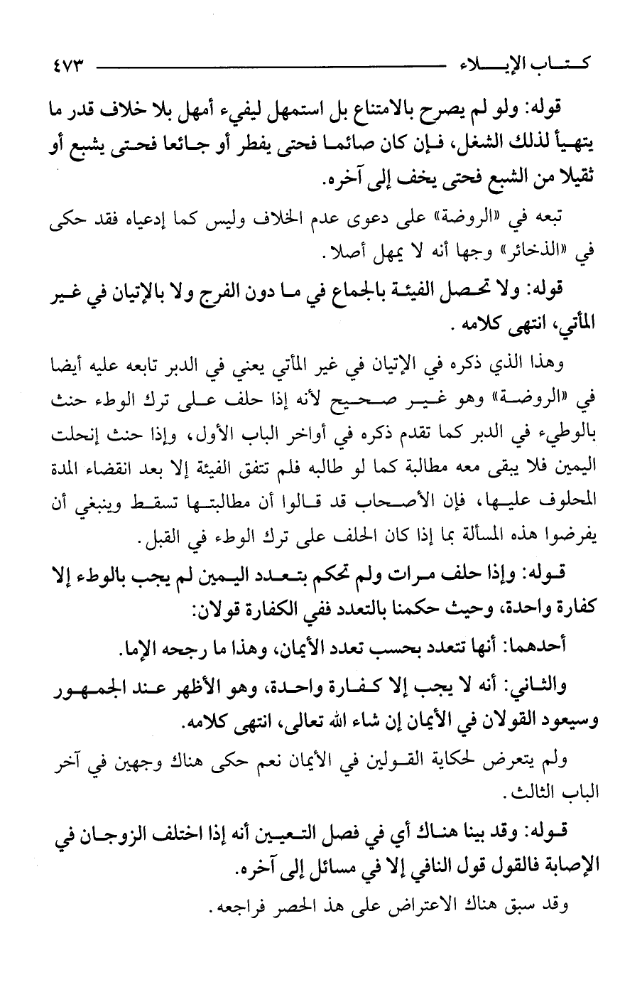 وهذا الذي ذكره في الإتيان في غير المأتي يعني في الدبر تابعه عليه أيضًا في "الروضة" وهو غير صحيح لأنه إذا حلف على ترك الوطء حنث بالوطيء في الدبر كما تقدم ذكره في أواخر الباب الأول، وإذا حنث إنحلت اليمين فلا يبقى معه مطالبة كما لو طالبه فلم تتفق الفيئة إلا بعد انقضاء المدة المحلوف عليها، فإن الأصحاب قد قالوا أن مطالبتها تسقط وينبغي أن يفرضوا هذه المسألة بما إذا كان الحلف على ترك الوطء في القبل.