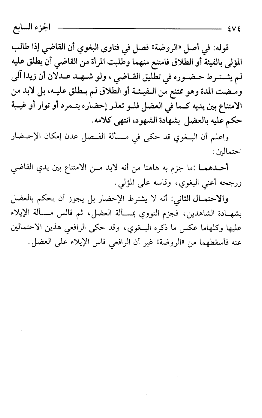 والاحتمال الثاني: أنه لا يشترط الإحضار بل يجوز أن يحكم بالعضل بشهادة الشاهدين، فجزم النووي بمسألة العضل، ثم قاس مسألة الإيلاء عليها وكلاهما عكس ما ذكره البغوي، وقد حكى الرافعي هذين الاحتمالين عنه فأسقطهما من "الروضة" غير أن الرافعي قاس الإيلاء على العضل.