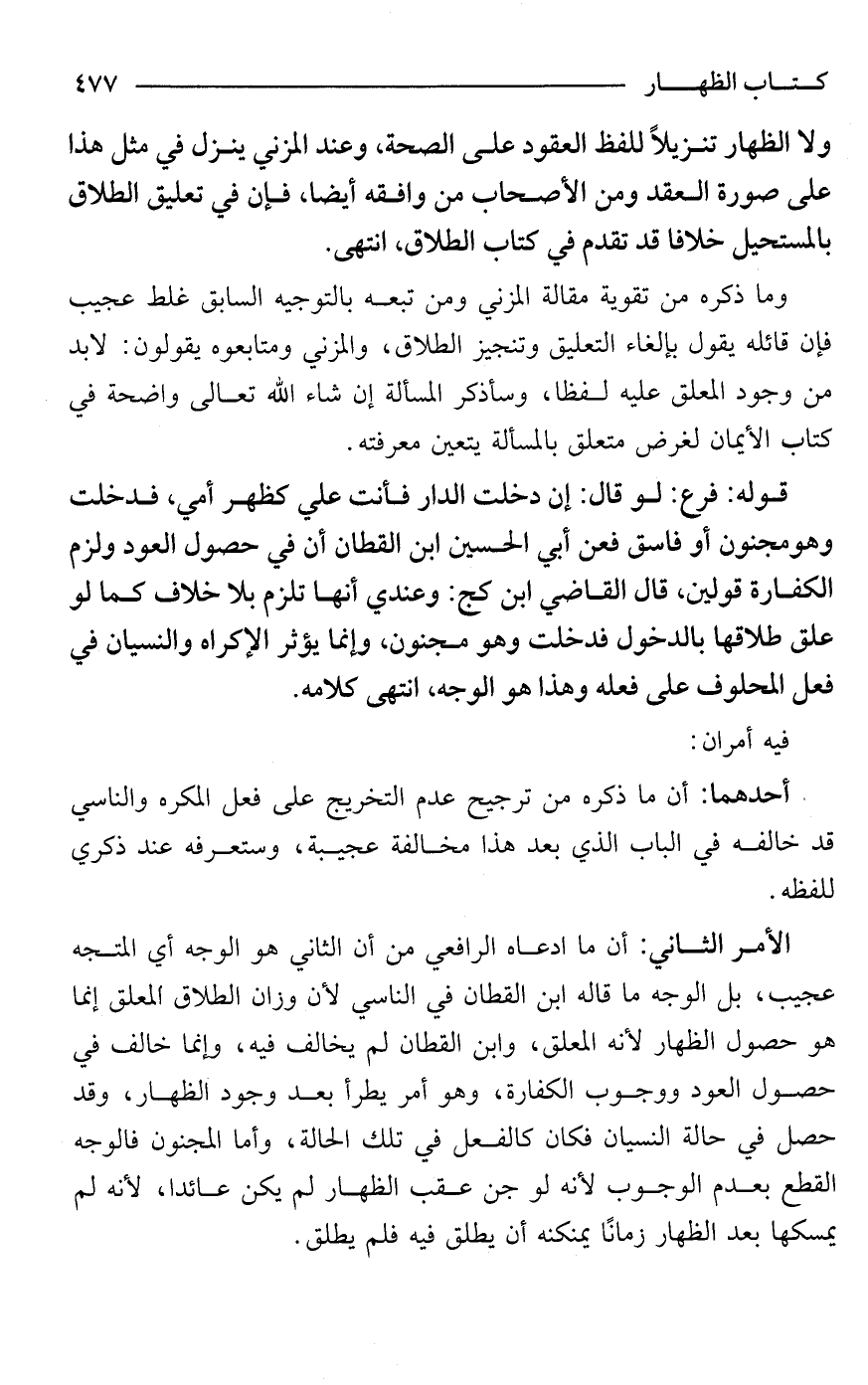 الأمر الثاني: أن ما ادعاه الرافعي من أن الثاني هو الوجه أي المتجه عجيب، بل الوجه ما قاله ابن القطان في الناسي لأن وزان الطلاق المعلق إنما هو حصول الظهار لأنه المعلق، وابن القطان لم يخالف فيه، وإنما خالف في حصول العود ووجوب الكفارة، وهو أمر يطرأ بعد وجود الظهار، وقد حصل في حالة النسيان فكان كالفعل في تلك الحالة، وأما المجنون فالوجه القطع بعدم الوجوب لأنه لو جن عقب الظهار لم يكن عائدًا، لأنه لم يمسكها بعد الظهار زمانًا يمكنه أن يطلق فيه فلم يطلق.