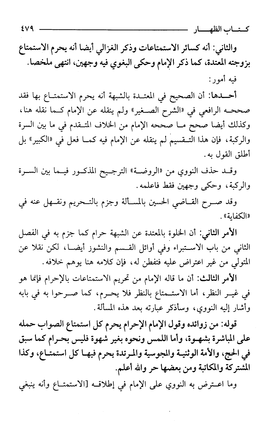 أحدها: أن الصحيح في المعتدة بالشبهة أنه يحرم الاستمتاع بها فقد صححه الرافعي في "الشرح الصغير" ولم ينقله عن الإمام كما نقله هنا، وكذلك أيضًا صحح ما صححه الإمام من الخلاف المتقدم في ما بين السرة والركبة، فإن هذا التقسيم لم ينقله عن الإمام فيه كما فعل في "الكبير" بل أطلق القول به.