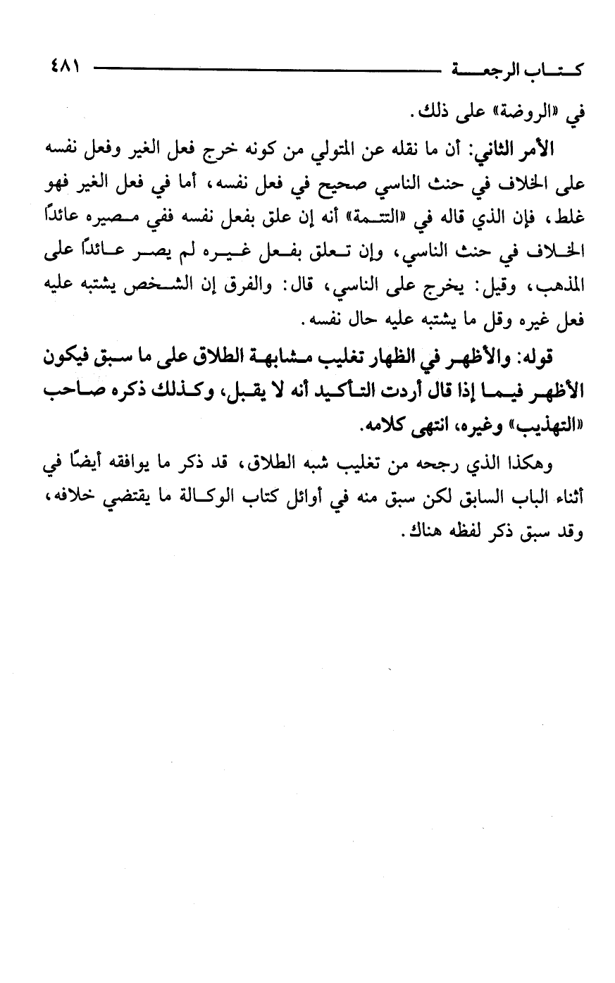 وهكذا الذي رجحه من تغليب شبه الطلاق، قد ذكر ما يوافقه أيضًا في أثناء الباب السابق لكن سبق منه في أوائل كتاب الوكالة ما يقتضي خلافه، وقد سبق ذكر لفظه هناك.