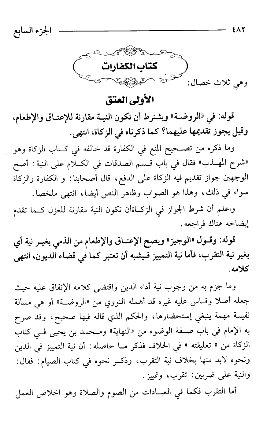 قوله: وقول "الوجيز" ويصح الإعتاق والإطعام من الذمي بغير نية أي بغير نية التقرب، فأما نية التمييز فيشبه أن تعتبر كما في قضاء الديون، انتهى كلامه.