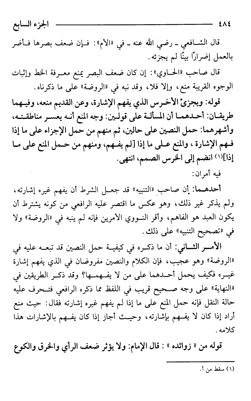 الأمر الثاني: أن ما ذكره في كيفية حمل النصين قد تبعه عليه في "الروضة" وهو عجيب، فإن الكلام والنصين مفروضان في الذي يفهم إشارة غيره فكيف يحمل أحدهما على من لا يفهمها؟ وقد ذكر الطريقين في "النهاية" على وجه صحيح قريب في اللفظ مما ذكره الرافعي فتحرف عليه حالة النقل فإنه حمل المنع على ما إذا لم يفهم غيره إشارته فقال: حيث منع أراد إذا كان لا يفهم بإشارته، وحيث أجاز إذا كان يفهم بالإشارات هذا كلامه.
