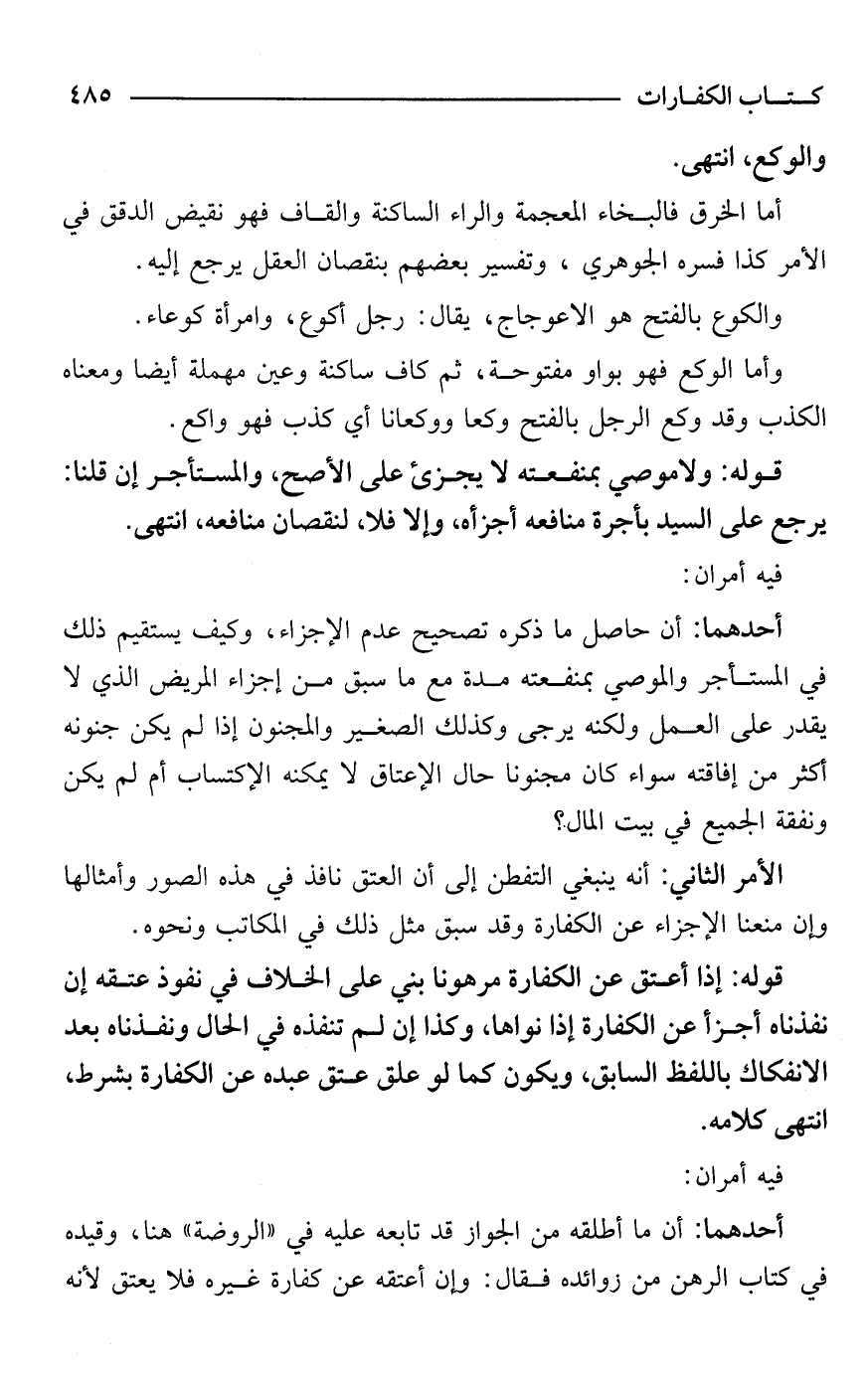 أحدهما: أن حاصل ما ذكره تصحيح عدم الإجزاء، وكيف يستقيم ذلك في المستأجر والموصي بمنفعته مدة مع ما سبق من إجزاء المريض الذي لا يقدر على العمل ولكنه يرجى وكذلك الصغير والمجنون إذا لم يكن جنونه أكثر من إفاقته سواء كان مجنونًا حال الإعتاق لا يمكنه الإكتساب أم لم يكن ونفقة الجميع في بيت المال؟