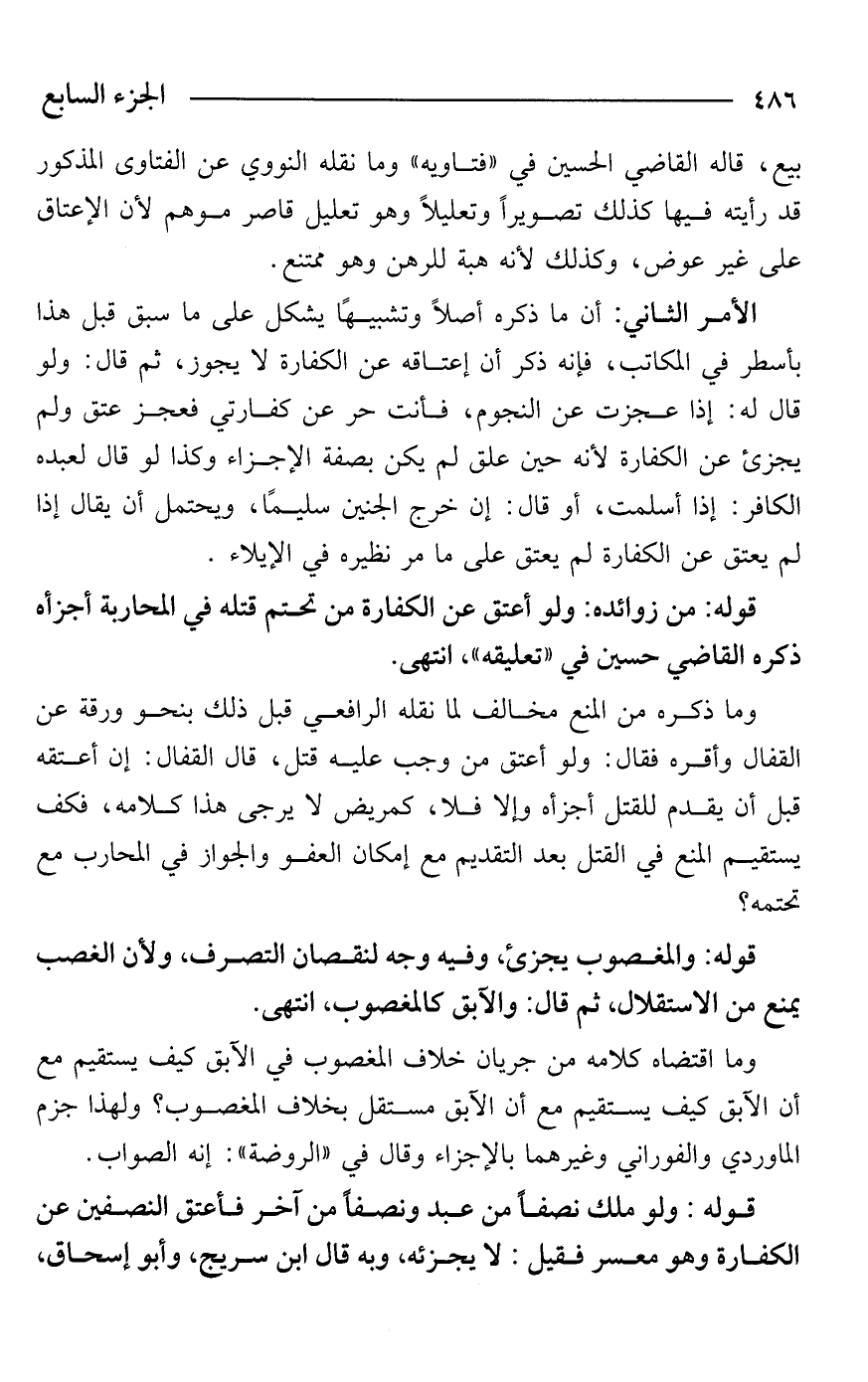 الأمر الثاني: أن ما ذكره أصلًا وتشبيهًا يشكل على ما سبق قبل هذا بأسطر في المكاتب، فإنه ذكر أن إعتاقه عن الكفارة لا يجوز، ثم قال: ولو قال له: إذا عجزت عن النجوم، فأنت حر عن كفارتي فعجز عتق ولم يجزئ عن الكفارة لأنه حين علق لم يكن بصفة الإجزاء وكذا لو قال لعبده الكافر: إذا أسلمت، أو قال: إن خرج الجنين سليمًا، ويحتمل أن يقال إذا لم يعتق عن الكفارة لم يعتق على ما مر نظيره في الإيلاء.