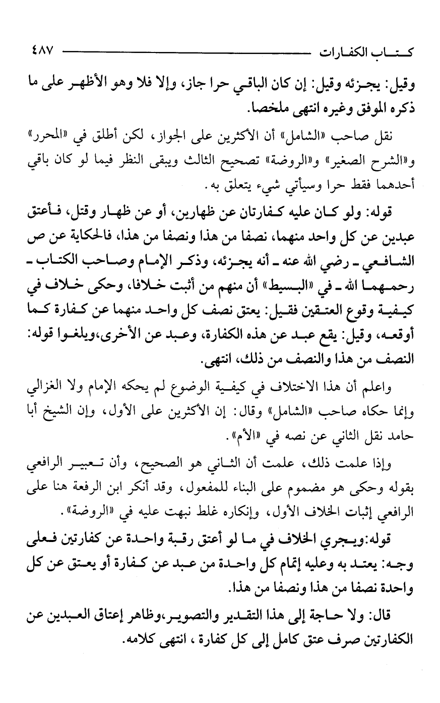 قوله: ويجري الخلاف في ما لو أعتق رقبة واحدة عن كفارتين فعلى وجه: يعتد به وعليه إتمام كل واحدة من عبد عن كفارة أو يعتق عن كل واحدة نصفًا من هذا ونصفًا من هذا.