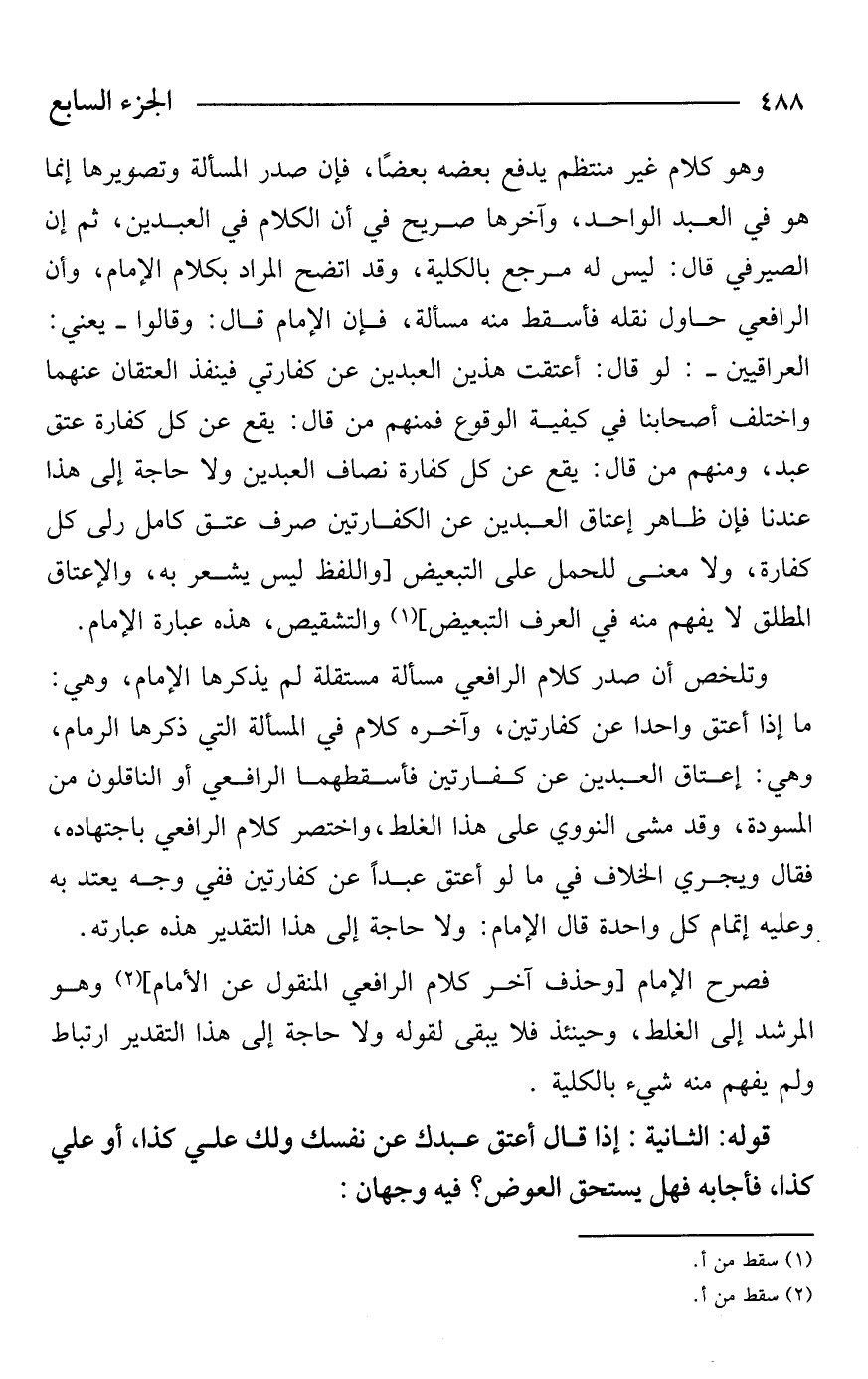وتلخص أن صدر كلام الرافعي مسألة مستقلة لم يذكرها الإمام، وهي: ما إذا أعتق واحدًا عن كفارتين، وآخره كلام في المسألة التي ذكرها الإمام، وهي: إعتاق العبدين عن كفارتين فأسقطهما الرافعي أو الناقلون من المسودة، وقد مشى النووي على هذا الغلط، واختصر كلام الرافعي باجتهاده، فقال ويجري الخلاف في ما لو أعتق عبدًا عن كفارتين ففي وجه يعتد به وعليه إتمام كل واحدة قال الإمام: ولا حاجة إلى هذا التقدير هذه عبارته.