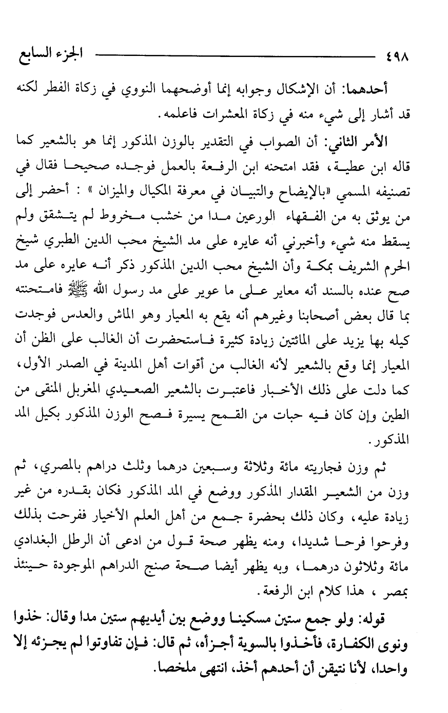 ثم وزن فجاريته مائة وثلاثة وسبعين درهمًا وثلث دراهم بالمصري، ثم وزن من الشعير المقدار المذكور ووضع في المد المذكور فكان بقدره من غير زيادة عليه، وكان ذلك بحضرة جمع من أهل العلم الأخيار ففرحت بذلك وفرحوا فرحًا شديدًا، ومنه يظهر صحة قول من ادعى أن الرطل البغدادي مائة وثلاثون درهمًا، وبه يظهر أيضًا صحة صنج الدراهم الموجودة حينئذ بمصر، هذا كلام ابن الرفعة.