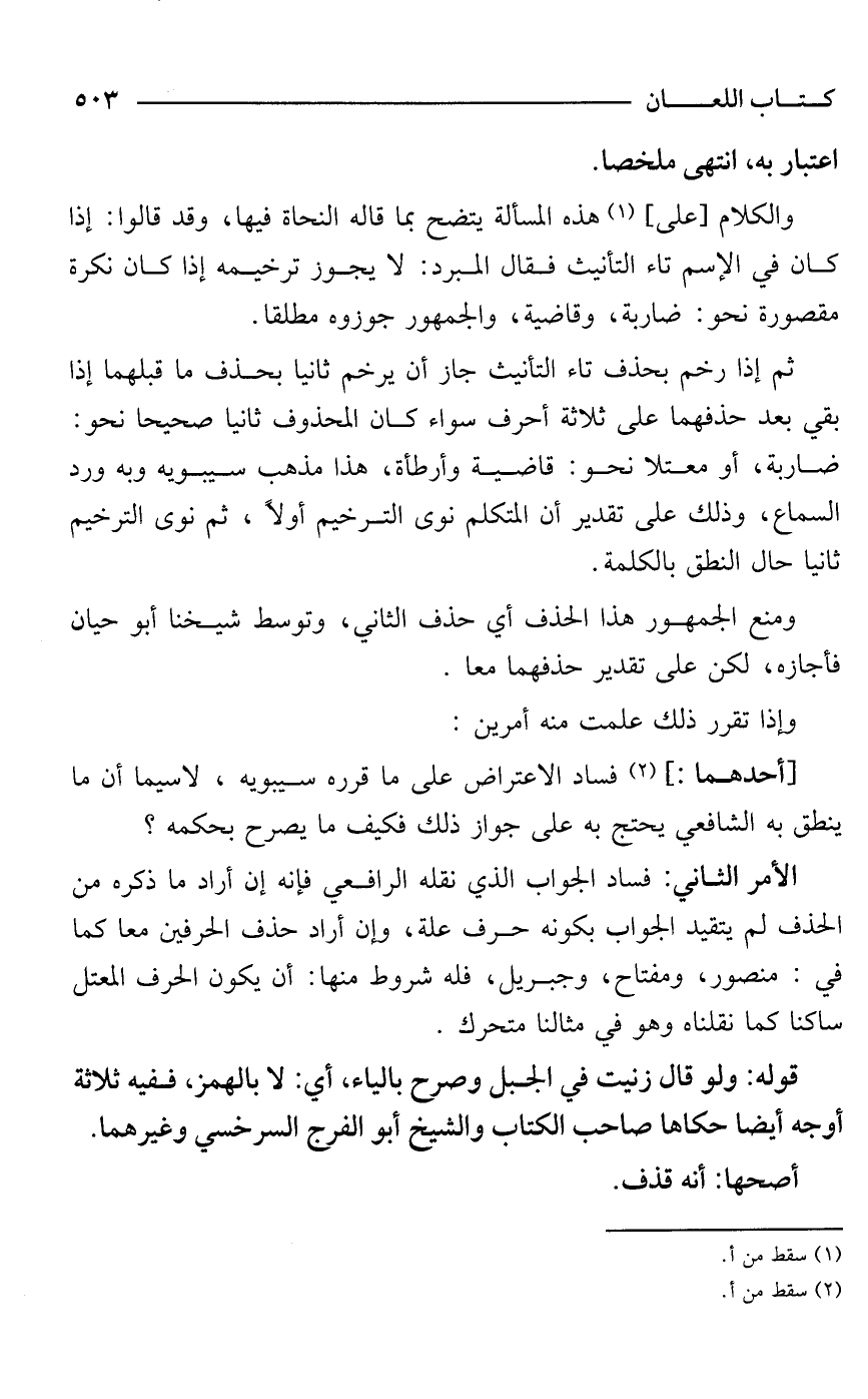 الأمر الثاني: فساد الجواب الذي نقله الرافعي فإنه إن أراد ما ذكره من الحذف لم يتقيد الجواب بكونه حرف علة، وإن أراد حذف الحرفين معًا كما في: منصور، ومفتاح، وجبريل، فله شروط منها: أن يكون الحرف المعتل ساكنًا كما نقلناه وهو في مثالنا متحرك.