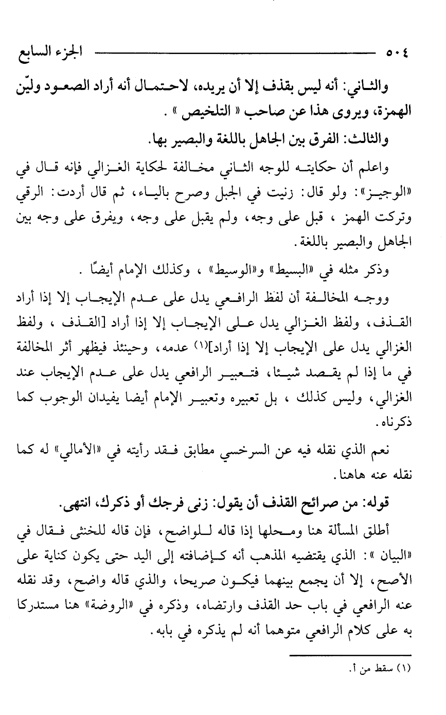 ووجه المخالفة أن لفظ الرافعي يدل على عدم الإيجاب إلا إذا أراد القذف، ولفظ الغزالي يدل على الإيجاب إلا إذا أراد [القذف، ولفظ الغزالي يدل على الإيجاب إلا إذا أراد] (¬1) عدمه، وحينئذ فيظهر أثر المخالفة في ما إذا لم يقصد شيئًا، فتعبير الرافعي يدل على عدم الإيجاب عند الغزالي، وليس كذلك، بل تعبيره وتعبير الإمام أيضًا يفيدان الوجوب كما ذكرناه.