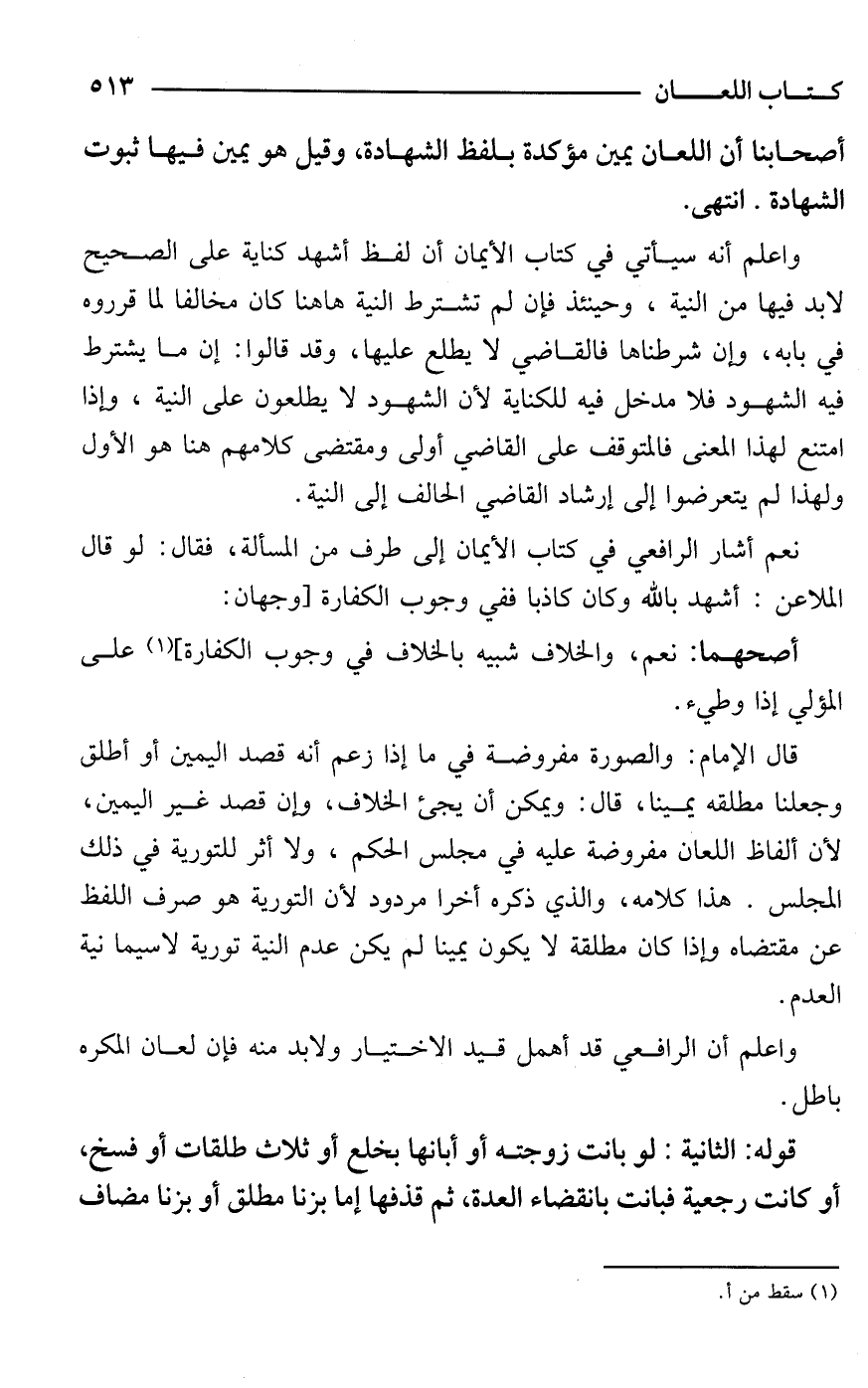 قال الإمام: والصورة مفروضة في ما إذا زعم أنه قصد اليمين أو أطلق وجعلنا مطلقه يمينًا، قال: ويمكن أن يجئ الخلاف، وإن قصد غير اليمين، لأن ألفاظ اللعان مفروضة عليه في مجلس الحكم، ولا أثر للتورية في ذلك المجلس. هذا كلامه، والذي ذكره أخرا مردود لأن التورية هو صرف اللفظ عن مقتضاه وإذا كان مطلقة لا يكون يمينًا لم يكن عدم النية تورية لاسيما نية العدم.