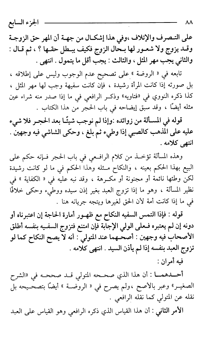 تابعه في "الروضة" على تصحيح عدم الوجوب وليس على إطلاقه، بل صورته إذا كانت المرأة رشيدة، فإن كانت سفيهة وجب لها مهر المثل، كذا ذكره النووي في "فتاويه" وذكر الرافعي في ما إذا صدر منه شراء عين مثله أيضًا، وقد سبق إيضاحه في باب الحجر من هذا الكتاب.