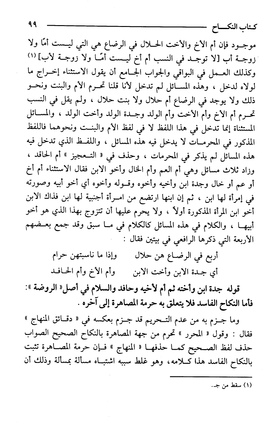 موجود فإن أم الأخ والأخت الحلال في الرضاع هي التي ليست أمًا ولا زوجة أب [لا توجد في النسب أم أخ ليست أمًا ولا زوجة لأب] (¬1) وكذلك العمل في البواقي والجواب الجامع أن يقول الاستثناء إخراج ما لولاه لدخل، وهذه المسائل لم تدخل لأنا قلنا تحرم الأم والبنت ونحو ذلك ولا يوجد في الرضاع أم حلال ولا بنت حلال، ولم يقل في النسب تحرم أم الأخ وأم الأخت وأم الولد وجدة الولد وأخت الولد، والمسائل المستثناة إنما تدخل في هذا اللفظ لا في لفظ الأم والبنت ونحوهما فاللفظ المذكور في المحرمات لا يدخل فيه هذه المسائل، واللفظ الذي تدخل فيه هذه المسائل لم يذكر في المحرمات، وحذف في "التعجيز" أم الحاقد، وزاد ثلاث مسائل وهي أم العم وأم الخال وأخو الابن فقال الاستثناء أم أخ أو عم أو خال وجدة ابن وأخيه وأخوه وقوله وأخوه أي أخو أبيه وصورته في إمرأة لها ابن, ثم إن ابنها ارتضع من امرأة أجنبية لها ابن فذاك الابن أخو ابن المرأة المذكورة أولًا, ولا يحرم عليها أن تتزوج بهذا الذي هو أخو أبيها، والكلام في هذه المسائل كالكلام في ما سبق وقد جمع بعضهم الأربعة التي ذكرها الرافعي في بيتين فقال: