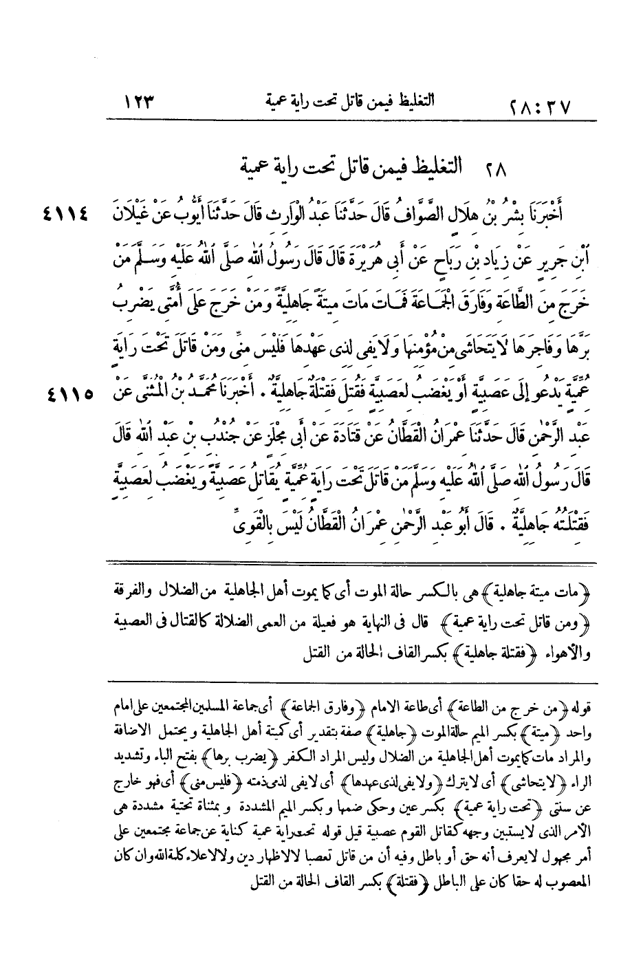 [4114] وَمَنْ قَاتَلَ تَحْتَ رَايَةٍ عِمِّيَّةٍ قَالَ فِي النِّهَايَة هُوَ فعيلة من الْعَمى الضَّلَالَة كَالْقِتَالِ فِي الْعَصَبِيَّةِ وَالْأَهْوَاءِ فَقِتْلَةٌ جَاهِلِيَّةٌ بِكَسْرِ الْقَاف الْحَالة من الْقَتْل