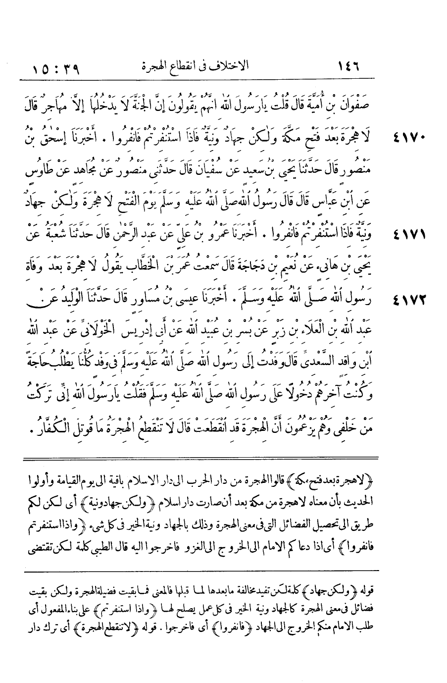[4169] لَا هِجْرَةَ بَعْدَ فَتْحِ مَكَّةَ قَالُوا الْهِجْرَةُ مِنْ دَارِ الْحَرْبِ إِلَى دَارِ الْإِسْلَامِ بَاقِيَةٌ إِلَى يَوْمِ الْقِيَامَةِ وَأَوَّلُوا الْحَدِيثَ بِأَنَّ مَعْنَاهُ لَا هِجْرَةَ مِنْ مَكَّةَ بَعْدَ أَنْ صَارَتْ دَار إِسْلَام وَلَكِنْ جِهَادٌ وَنِيَّةٌ أَيْ لَكِنْ لَكُمْ طَرِيقٌ إِلَى تَحْصِيلِ الْفَضَائِلِ الَّتِي فِي مَعْنَى الْهِجْرَةِ وَذَلِكَ بِالْجِهَادِ وَنِيَّةِ الْخَيْرِ فِي كُلِّ شَيْءٍ وَإِذَا اُسْتُنْفِرْتُمْ فَانْفِرُوا أَيْ إِذَا دَعَاكُمُ الْإِمَامُ إِلَى الْخُرُوجِ إِلَى الْغَزْوِ فَاخْرُجُوا إِلَيْهِ قَالَ الطِّيبِيُّ كَلِمَةُ لَكِنْ تَقْتَضِي مُخَالَفَةَ مَا بَعْدَهَا لِمَا قَبْلَهَا أَيِ الْمُفَارَقَةُ عَنِ الْأَوْطَانِ الْمُسَمَّاةُ بِالْهِجْرَةِ الْمُطْلَقَةِ انْقَطَعَتْ لَكِنَّ الْمُفَارَقَةَ بِسَبَبِ الْجِهَادِ بَاقِيَةٌ مَدَى الدَّهْرِ وَكَذَا الْمُفَارَقَةُ بِسَبَبِ نِيَّةٍ خَالِصَةٍ لِلَّهِ تَعَالَى كَطَلَبِ الْعِلْمِ وَالْفِرَارِ بِدِينِهِ وَنَحْوِ ذَلِك إِنَّ امْرَأَةً أَسْعَدَتْنِي فِي الْجَاهِلِيَّةِ الْإِسْعَادُ الْمُعَاوَنَةُ فِي النِّيَاحَة خَاصَّة وَعَكٌ هُوَ الْحُمَّى وَقِيلَ أَلَمُهَا