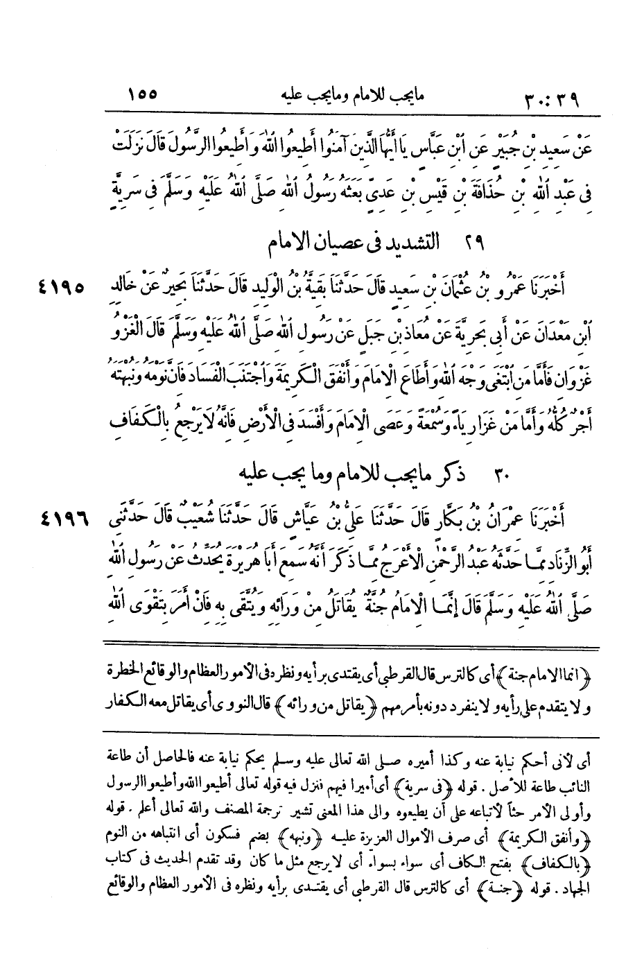 [4196] إِنَّمَا الْإِمَامُ جُنَّةٌ أَيْ كَالتُّرْسِ قَالَ الْقُرْطُبِيُّ أَيْ يُقْتَدَى بِرَأْيِهِ وَنَظَرِهِ فِي الْأُمُورِ الْعِظَامِ وَالْوَقَائِعِ الْخَطِرَةِ وَلَا يُتَقَدَّمُ عَلَى رَأْيِهِ وَلَا يُنْفَرَدُ دُونَهُ بِأَمْرٍ مُهِمٍّ يُقَاتَلُ مِنْ وَرَائِهِ قَالَ النَّوَوِيُّ أَيْ يُقَاتَلُ مَعَهُ الْكُفَّارُ