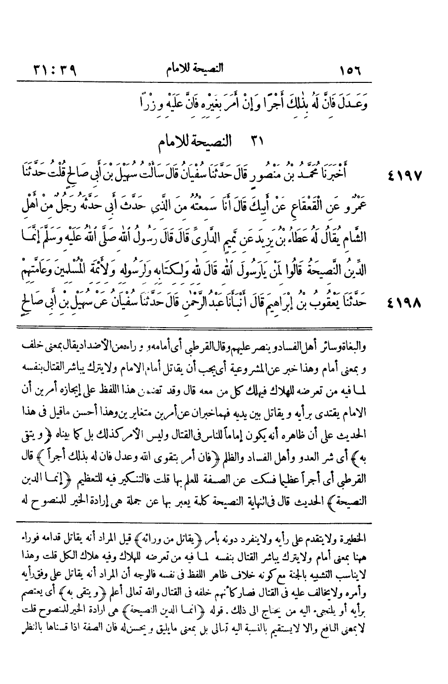[4197] إِنَّمَا الدِّينُ النَّصِيحَةُ الْحَدِيثَ قَالَ فِي النِّهَايَةِ النَّصِيحَةُ كَلِمَةٌ يُعَبَّرُ بِهَا عَنْ جُمْلَةٍ هِيَ إِرَادَةُ الْخَيْرِ لِلْمَنْصُوحِ لَهُ وَلَيْسَ يُمْكِنُ أَنْ يُعَبَّرَ عَنْ هَذَا الْمَعْنَى بِكَلِمَةٍ وَاحِدَةٍ يَجْمَعُ مَعْنَاهُ غَيْرُهَا وَأَصْلُ النُّصْحِ فِي اللُّغَةِ الْخُلُوصُ يُقَالُ نَصَحْتُهُ وَنَصَحْتُ لَهُ وَمَعْنَى النَّصِيحَةِ لِلَّهِ صِحَّةُ الِاعْتِقَادِ فِي وَحْدَانِيَّتِهِ وَإِخْلَاصُ النِّيَّةِ فِي عِبَادَتِهِ وَالنَّصِيحَةُ لِكِتَابِ اللَّهِ هُوَ التَّصْدِيقُ بِهِ وَالْعَمَلُ بِمَا فِيهِ وَنَصِيحَةُ رَسُولِهِ التَّصْدِيقُ بِنُبُوَّتِهِ وَرِسَالَتِهِ وَالِانْقِيَادُ لِمَا أَمَرَ بِهِ وَنَهَى عَنْهُ وَنَصِيحَةُ الْأَئِمَّةِ أَنْ يُطِيعَهُمْ فِي الْحَقِّ وَلَا يرى