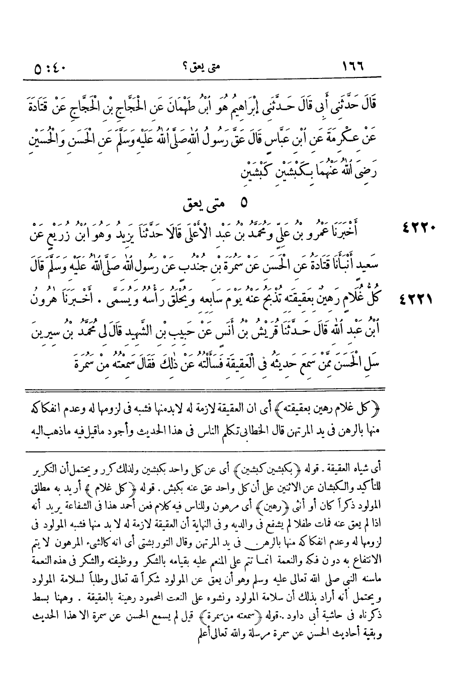 [4219] بكبشين كبشين أَي عَن كل وَاحِد بكبشين وَلذَلِك كرر وَيحْتَمل أَن التكرير للتَّأْكِيد والكبشان عَن الْإِثْنَيْنِ على أَن كل وَاحِد عق عَنهُ بكبش قَوْله كل غُلَام أُرِيد بِهِ مُطلق الْمَوْلُود ذكرا كَانَ أَو أُنْثَى رهين أَي مَرْهُون وَلِلنَّاسِ فِيهِ كَلَام فَعَن أَحْمد هَذَا فِي الشَّفَاعَةِ يُرِيدُ أَنَّهُ إِذَا لَمْ يَعُقَّ عَنْهُ فَمَاتَ طِفْلًا لَمْ يَشْفَعْ فِي وَالِديهِ وَفِي النِّهَايَة أَنَّ الْعَقِيقَةَ لَازِمَةٌ لَهُ لَا بُدَّ مِنْهَا فَشبه الْمَوْلُود فِي لُزُومِهَا لَهُ وَعَدَمِ انْفِكَاكِهِ مِنْهَا بِالرَّهْنِ فِي يدالمرتهن وَقَالَ التوربشتي أَي انه كالشيء الْمَرْهُون لَا يتم الِانْتِفَاع بِهِ دون فكه وَالنعْمَة انما تتمّ على الْمُنعم عَلَيْهِ بقيامه بالشكر ووظيفته وَالشُّكْر فِي هَذِه النِّعْمَة مَا سنه النَّبِي صلى الله تَعَالَى عَلَيْهِ وَسلم وَهُوَ أَن يعق عَن الْمَوْلُود شكر الله تَعَالَى وطلبا لِسَلَامَةِ الْمَوْلُود وَيحْتَمل أَنه أَرَادَ بذلك أَن سَلامَة الْمَوْلُود ونشوه على النَّعْت الْمَحْمُود رهينة بالعقيقة وَهَا هُنَا بسط ذَكرْنَاهُ فِي حَاشِيَة أبي داودقوله