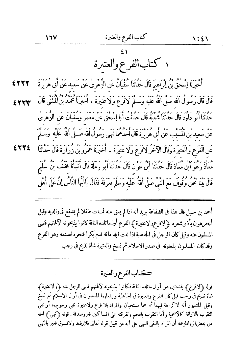 [4222] لَا فَرَعَ وَلَا عَتِيرَةَ الْفَرَعُ أَوَّلُ مَا تَلِدُهُ النَّاقَةُ كَانُوا يَذْبَحُونَهُ لِآلِهَتِهِمْ فَنُهِيَ الْمُسْلِمُونَ عَنْهُ وَقِيلَ كَانَ الرَّجُلُ فِي الْجَاهِلِيَّةِ إِذَا تَمَّتْ إِبِلُهُ مِائَةً قَدَّمَ بِكْرًا فَنَحَرَهُ لِصَنَمِهِ وَهُوَ الْفَرَعُ وَقَدْ كَانَ الْمُسْلِمُونَ يَفْعَلُونَهُ فِي صَدْرِ الْإِسْلَامِ ثُمَّ نُسِخَ وَالْعَتِيرَةُ شَاةٌ تُذْبَحُ فِي رَجَب إِذا اسْتَجْمَلَ بِالْجِيمِ أَيْ صَارَ جَمَلًا وَبِالْحَاءِ أَيْ صَار بِحَيْثُ يحمل عَلَيْهِ