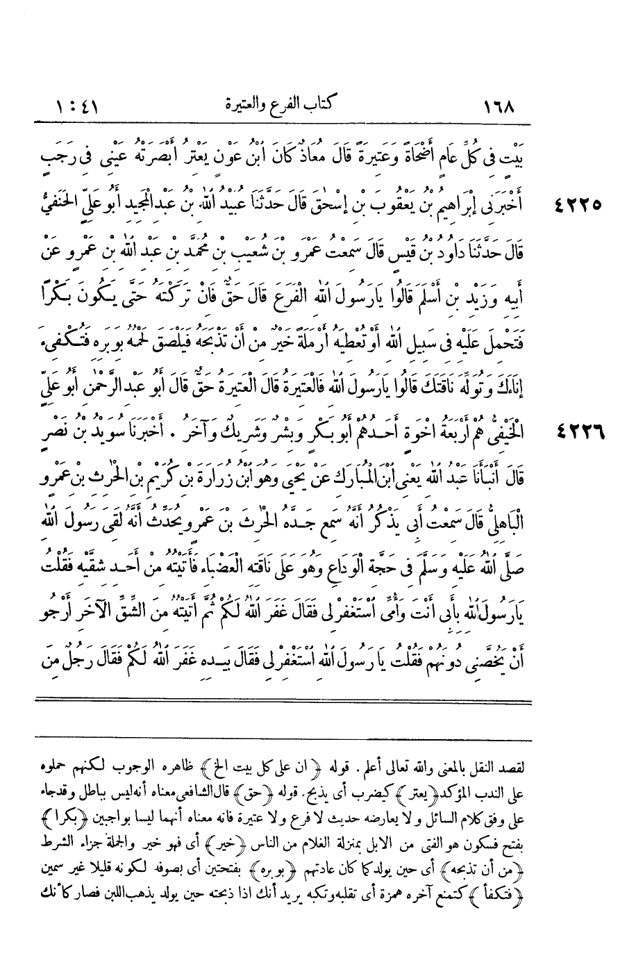 لقصد النَّقْل بِالْمَعْنَى وَالله تَعَالَى أعلم قَوْله ان على كل بَيت الخ ظَاهره الْوُجُوب لكِنهمْ حملوه على النّدب الْمُؤَكّد يعتر كيضرب أَي يذبح قَوْله حق قَالَ الشَّافِعِي مَعْنَاهُ أَنه لَيْسَ بباطل وَقد جَاءَ على وفْق كَلَام السَّائِل وَلَا يُعَارضهُ حَدِيث لَا فرع وَلَا عتيرة فَإِنَّهُ مَعْنَاهُ أَنَّهُمَا ليسَا بواجبين بكرا بِفَتْح فَسُكُون هُوَ الْفَتِيُّ مِنْ الْإِبِلِ بِمَنْزِلَةِ الْغُلَامِ مِنَ النَّاسِ خير أَي فَهُوَ خير وَالْجُمْلَة جَزَاء الشَّرْط من أَن تذبحه أَي حِين يُولد كَمَا كَانَ عَادَتهم بوبره بِفتْحَتَيْنِ أَي بصوفه لكَونه قَلِيلا غير سمين فتكفأ كتمنع آخِره همزَة أَي تقلبه وتكبه يُرِيد أَنَّك إِذا ذبحته حِين يُولد يذهب اللَّبن فَصَارَ كَأَنَّك