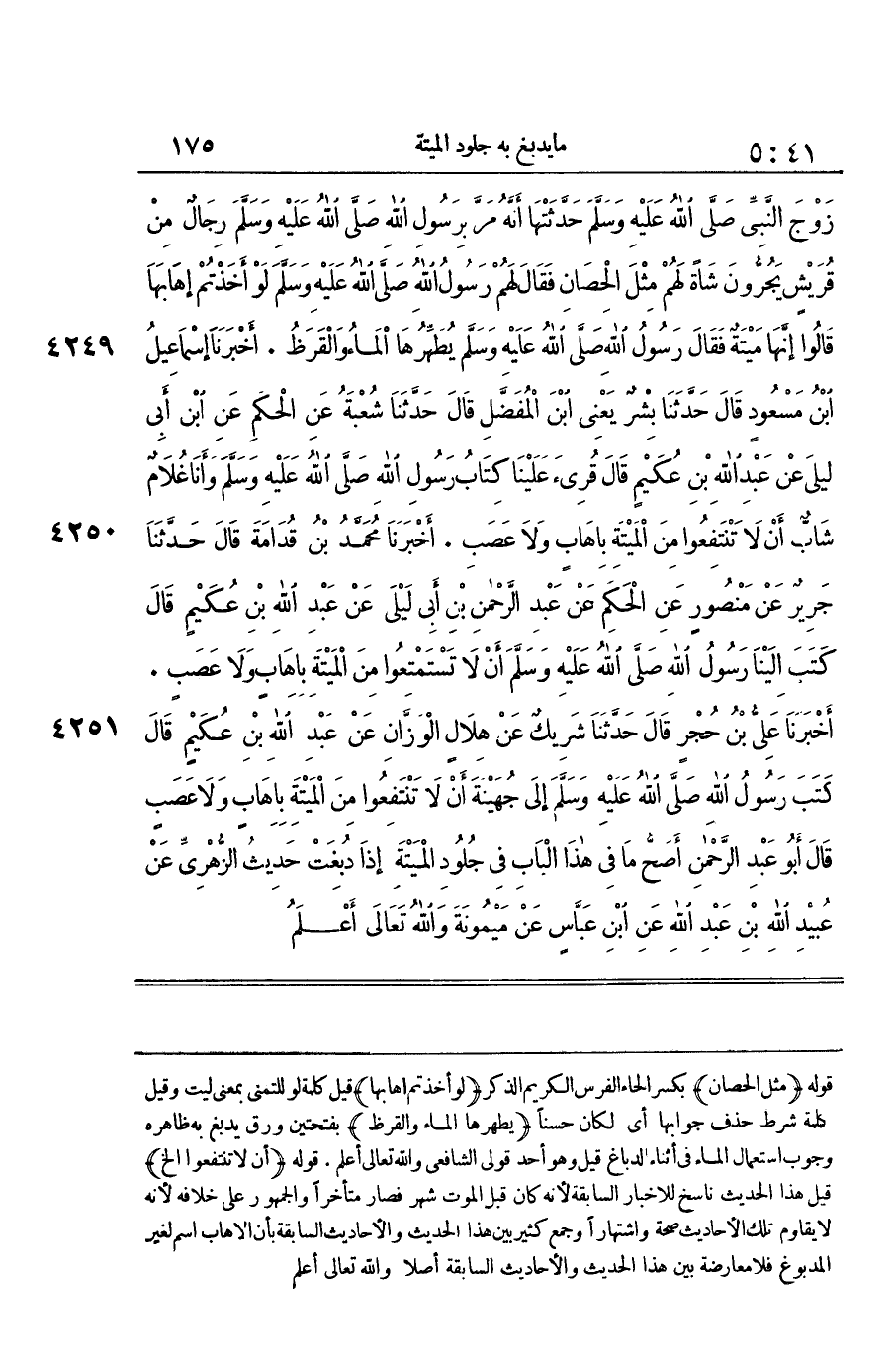 [4249] أَن لَا تنتفعوا الخ قيل هَذَا الحَدِيث نَاسخ للْأَخْبَار السَّابِقَة لِأَنَّهُ كَانَ قبل الْمَوْت شهر فَصَارَ مُتَأَخِّرًا وَالْجُمْهُور على خِلَافه لِأَنَّهُ لَا يُقَاوم تِلْكَ الْأَحَادِيث صِحَة واشتهارا وَجمع كثير بَين هَذَا الحَدِيث وَالْأَحَادِيث السَّابِقَة بِأَن الاهاب اسْم لغير المدبوغ فَلَا مُعَارضَة بَين هَذَا الحَدِيث وَالْأَحَادِيث السَّابِقَة أصلا وَالله تَعَالَى أعلم قَوْله أَمر أَي أذن وَرخّص أَن يسْتَمْتع على بِنَاء الْمَفْعُول قَوْله