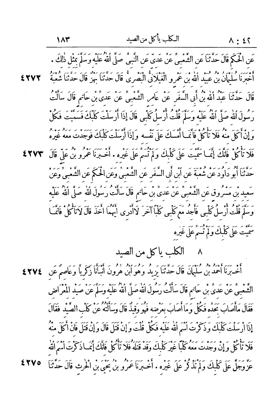 4272 - أَخْبَرَنَا سُلَيْمَانُ بْنُ عُبَيْدِ اللَّهِ بْنِ عَمْرٍو الْغَيْلَانِيُّ الْبَصْرِيُّ قَالَ: حَدَّثَنَا بَهْزٌ قَالَ: حَدَّثَنَا شُعْبَةُ قَالَ: حَدَّثَنَا عَبْدُ اللَّهِ بْنُ أَبِي السَّفَرِ، عَنْ عَامِرٍ الشَّعْبِيِّ، عَنْ عَدِيِّ بْنِ حَاتِمٍ قَالَ: سَأَلْتُ رَسُولَ اللَّهِ صَلَّى اللهُ عَلَيْهِ وَسَلَّمَ قُلْتُ: أُرْسِلُ كَلْبِي؟ قَالَ: «§إِذَا أَرْسَلْتَ كَلْبَكَ فَسَمَّيْتَ فَكُلْ، وَإِنْ أَكَلَ مِنْهُ فَلَا تَأْكُلْ، فَإِنَّمَا أَمْسَكَ عَلَى نَفْسِهِ، وَإِذَا أَرْسَلْتَ كَلْبَكَ فَوَجَدْتَ مَعَهُ غَيْرَهُ فَلَا تَأْكُلْ، فَإِنَّكَ إِنَّمَا سَمَّيْتَ عَلَى كَلْبِكَ، وَلَمْ تُسَمِّ عَلَى غَيْرِهِ»