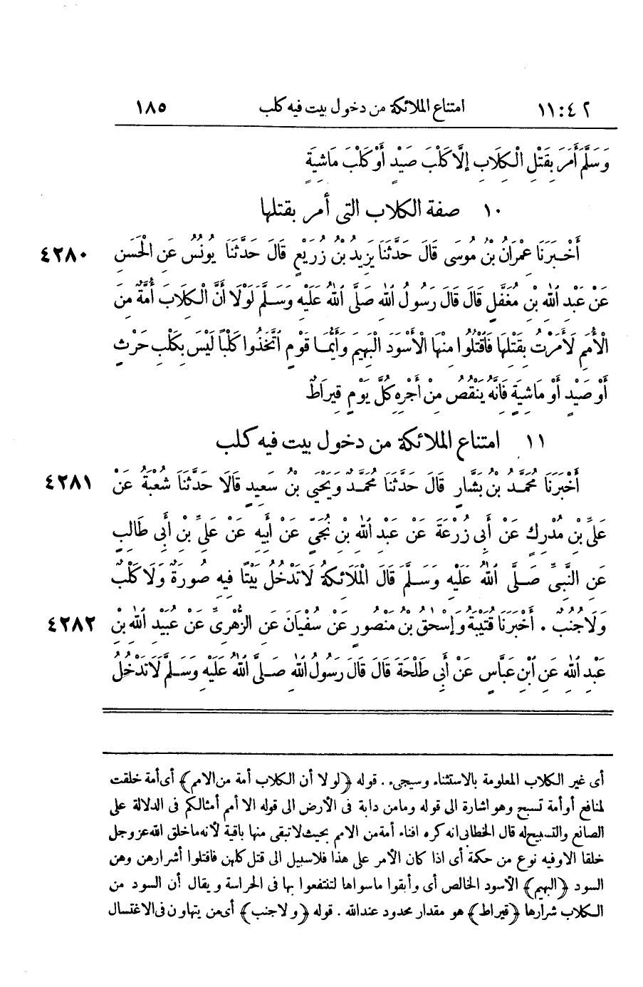 [4280] لَوْلَا أَن الْكلاب أمة من الْأُمَم أَي أمة خلقت لمنافع أَو أمة تسبح وَهُوَ إِشَارَة إِلَى قَوْله وَمَا من دَابَّة فِي الأَرْض إِلَى قَوْله الا أُمَم أمثالكم فِي الدّلَالَة على الصَّانِع وَالتَّسْبِيح لَهُ قَالَ الْخطابِيّ انه كره افناء أمة من الْأُمَم بِحَيْثُ لَا تبقى منهاباقية لِأَنَّهُ مَا خلق الله عز وَجل خلقا الا وَفِيه نوع من حِكْمَة أَي إِذا كَانَ الْأَمر على هَذَا فَلَا سَبِيل إِلَى قتل كُلهنَّ فَاقْتُلُوا أشرارهن وَهن السود البهيم الأسودالخالص أَي وأبقوا مَا سواهَا لتنتفعوا بهَا فِي الحراسة وَيُقَال أَن السود من الْكلاب شِرَارهَا قِيرَاط هُوَ مِقْدَار مَحْدُود عِنْد الله