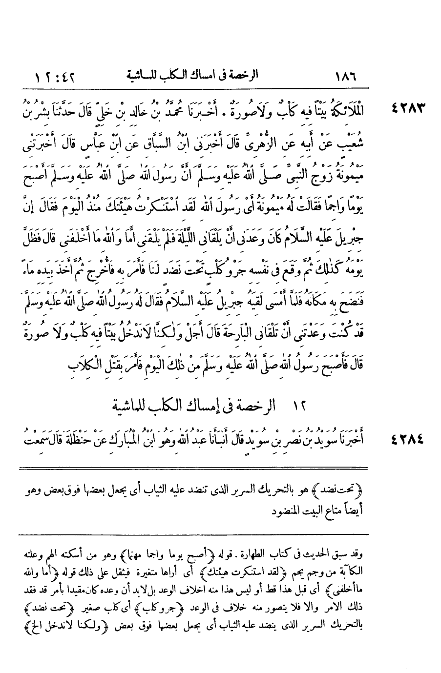 [4283] أصبح يَوْمًا واجما مهتما وَهُوَ من أسكته الْهم وعلته الكآبة من وجم يجم لقد استنكرت هيئتك أَي أَرَاهَا متغيرة فيثقل على ذَلِك قَوْله أما وَالله مَا أخلفني أَي قبل هَذَا قطّ أَو لَيْسَ هَذَا مِنْهُ اخلاف الْوَعْد بل لَا بُد أَن وعده كَانَ مُقَيّدا بِأَمْر قد فقد ذَلِك الْأَمر والا فَلَا يتَصَوَّر مِنْهُ خلاف فِي الْوَعْد جرو كلب أَي كلب صَغِير تَحت نضد بِالتَّحْرِيكِ السرير الَّذِي ينضد عَلَيْهِ الثِّيَابُ أَيْ يُجْعَلُ بَعْضُهَا فَوْقَ بَعْضٍ وَلَكنَّا لَا ندخل الخ أَي وَكَانَ الْوَعْد مُقَيّدا بِعَدَمِ الْمَانِع فَمَا أخلفت الْوَعْد وَالله تَعَالَى أعلم قَوْله